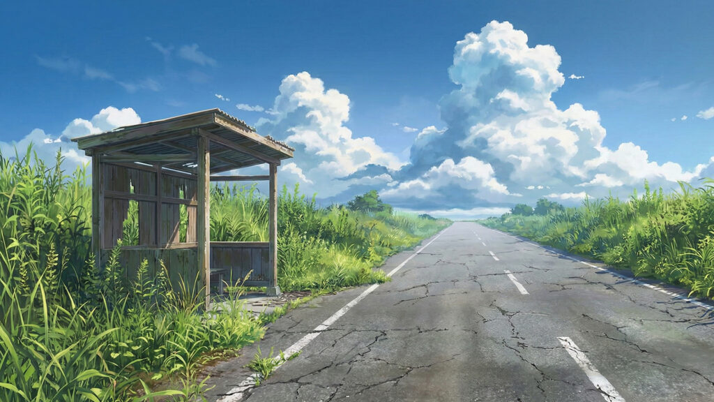夏草が生い茂る田舎のバス停と一本道(3枚)