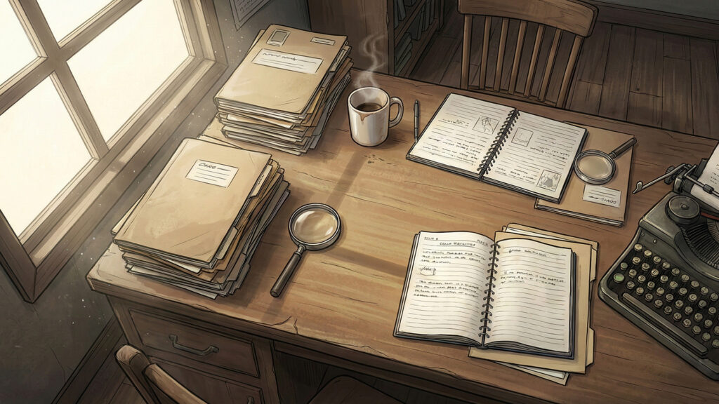 書類とコーヒーカップが置かれた探偵事務所のデスク(3枚)
