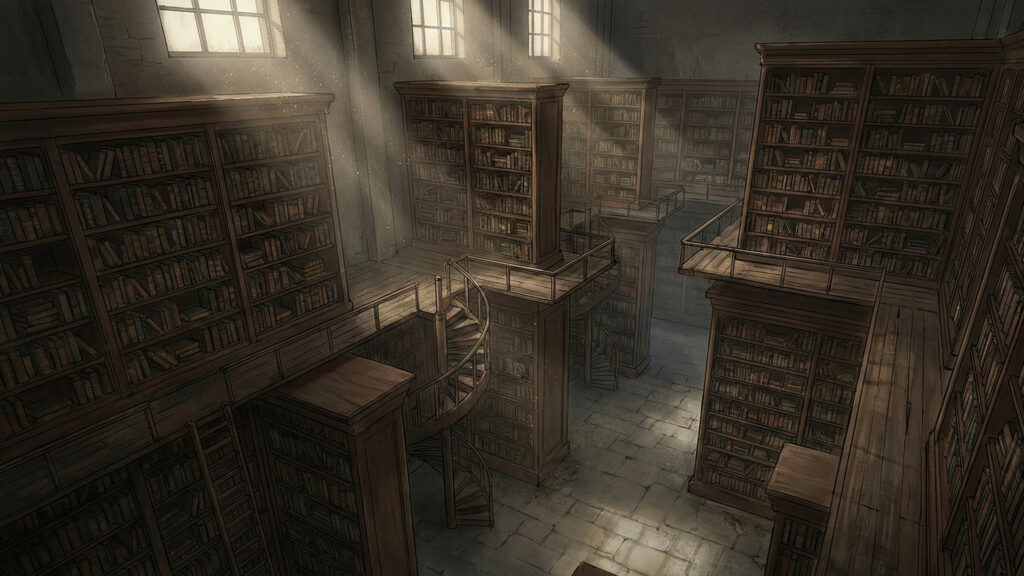 薄暗い照明の中に本棚が並ぶ古びた図書館(3枚)