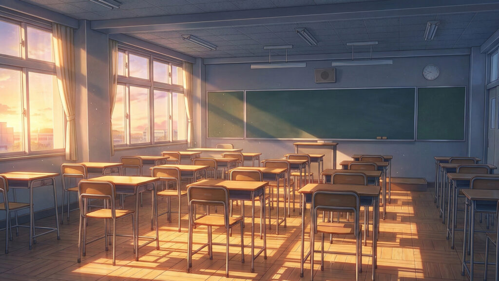 放課後の夕日が差し込む誰もいない教室(3枚)