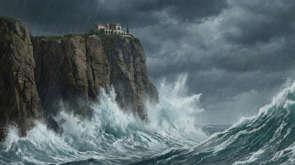嵐が吹き荒れる断崖絶壁に建つ別荘の外観(3枚)
