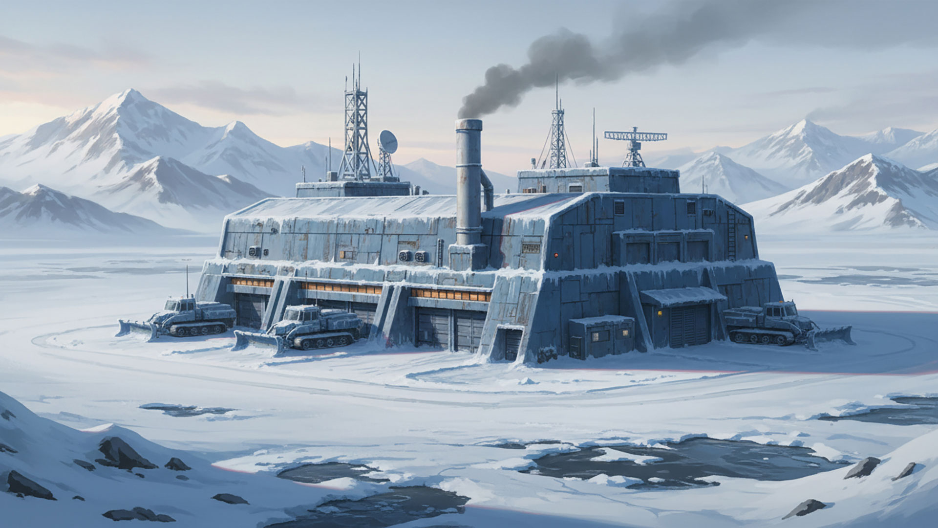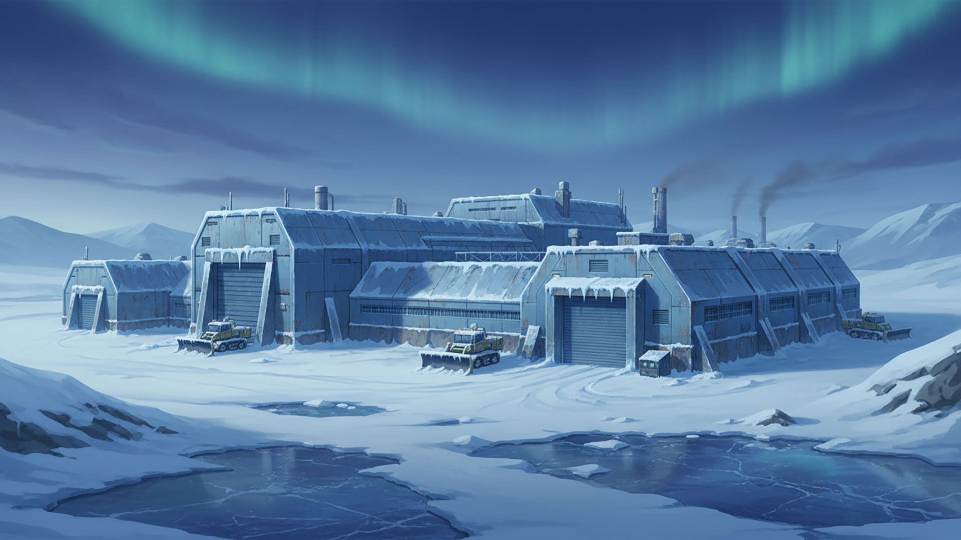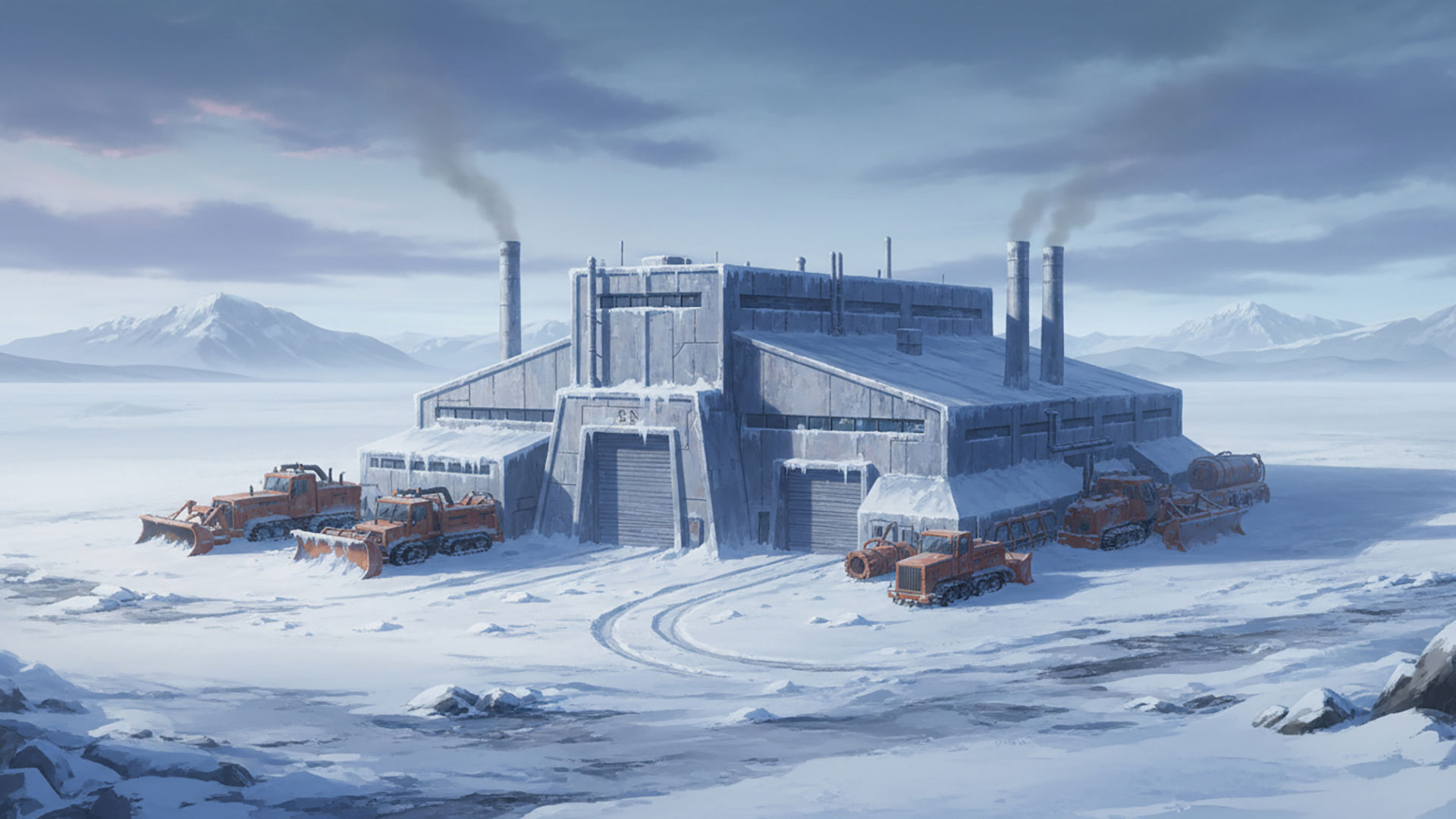 検索キーワード:整備施設, 雪原, 工場, 極寒, メンテナンス, 背景素材, Maintenance Facility, Snowfield, Factory, Frozen, Workshop, Background