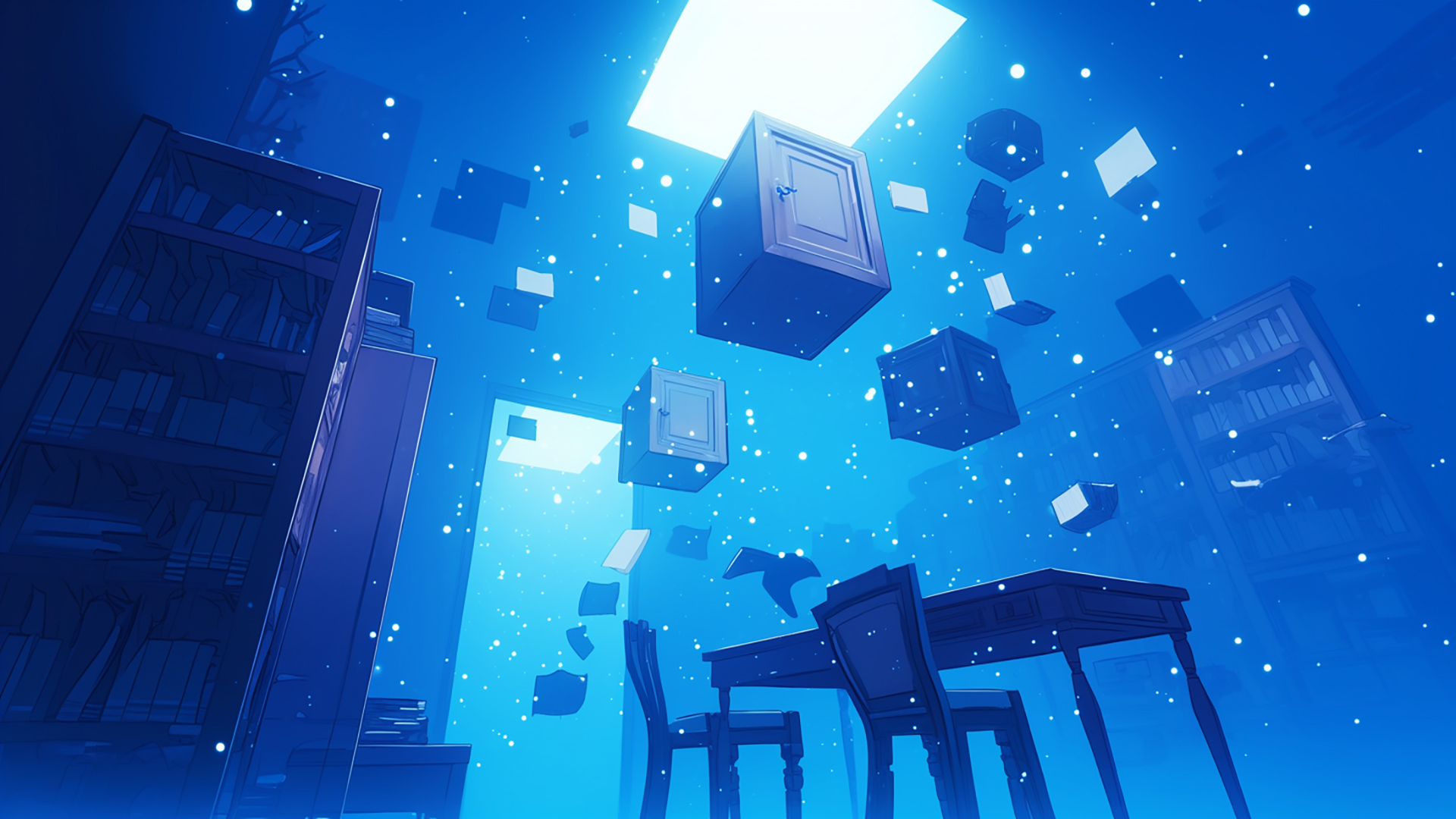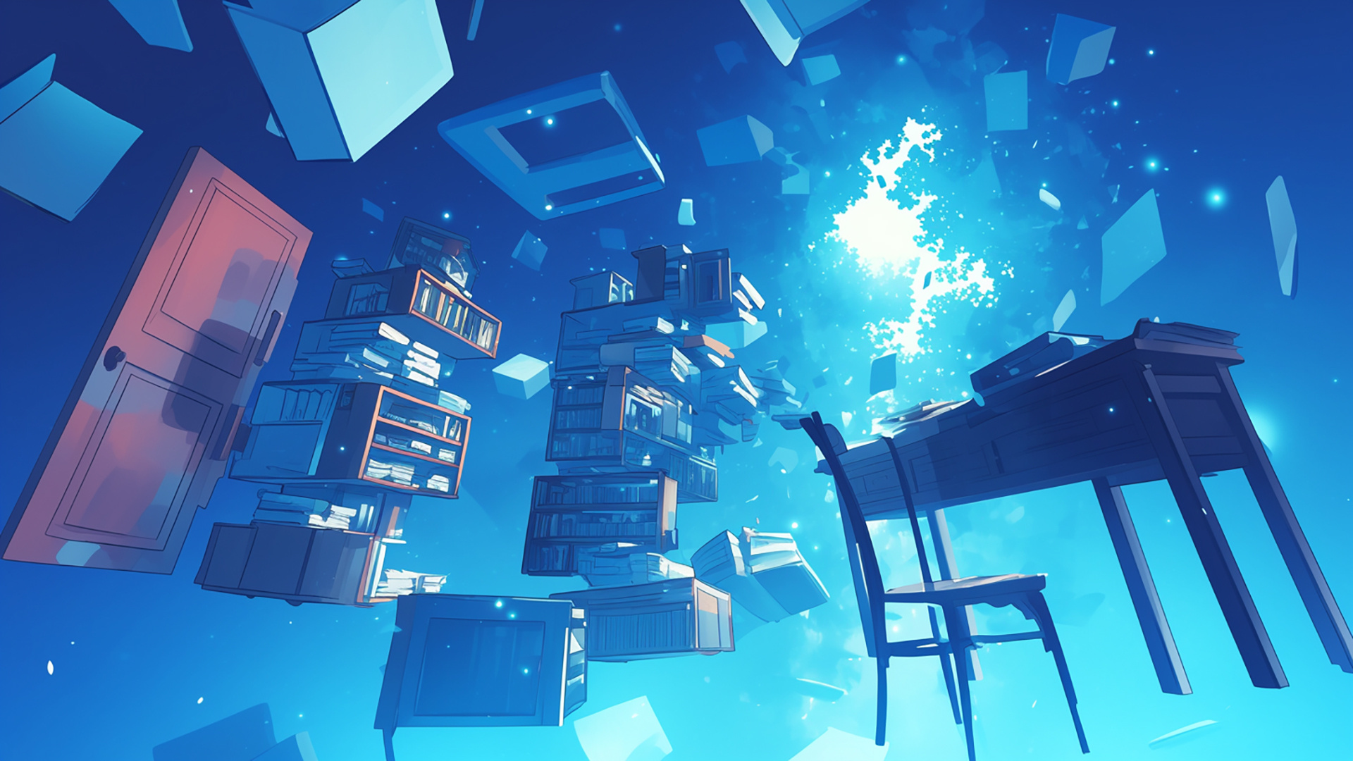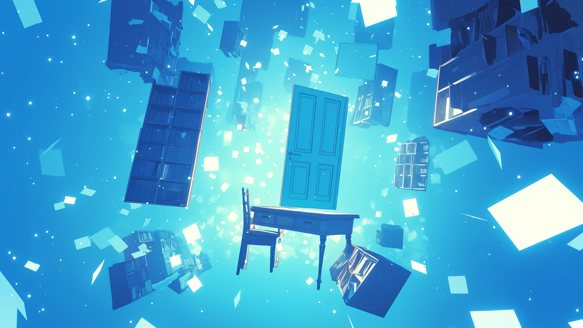 検索キーワード:浮遊家具,不思議部屋,超常現象,夢空間,無重力,幻想 interior, levitating furniture, surreal room, paranormal, dream space, zero-gravity atmosphere