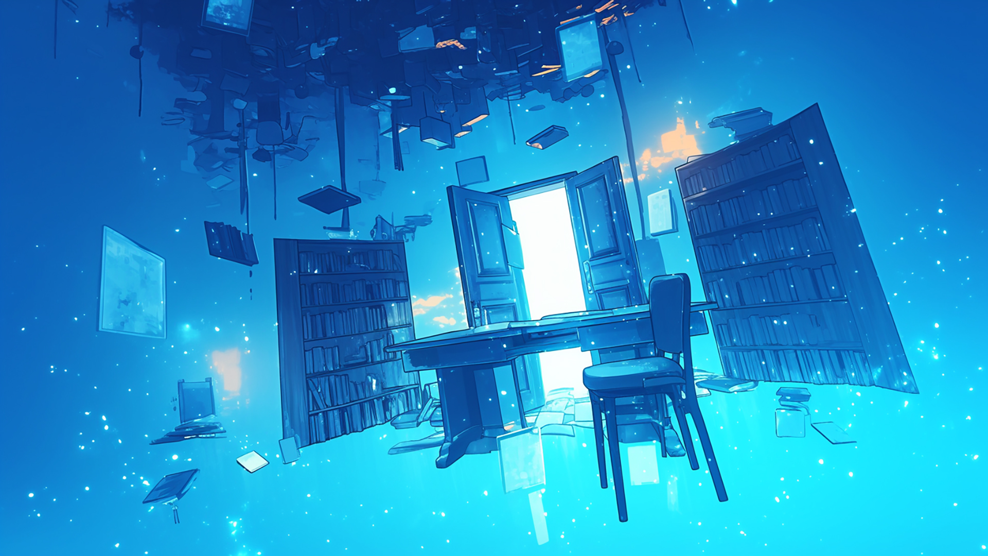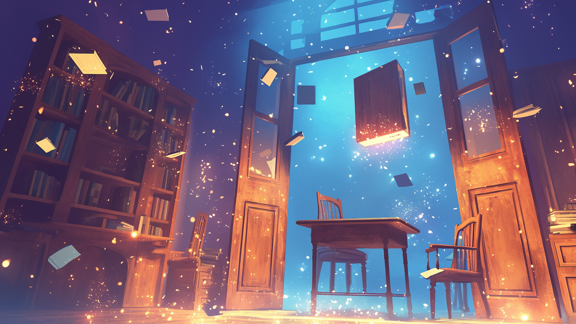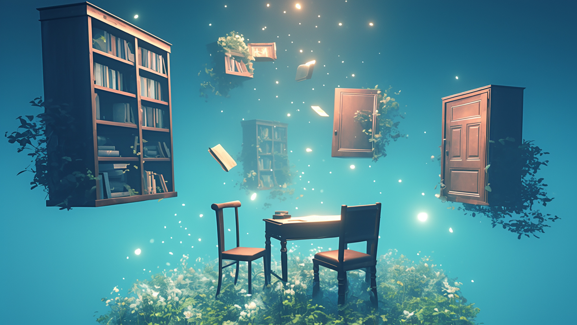 検索キーワード:浮遊家具,不思議部屋,超常現象,夢空間,無重力,幻想 interior, levitating furniture, surreal room, paranormal, dream space, zero-gravity atmosphere