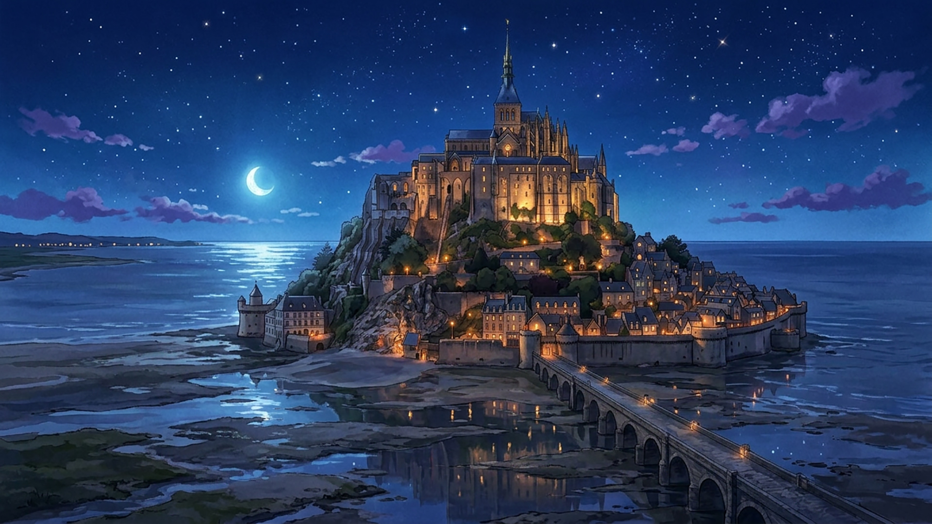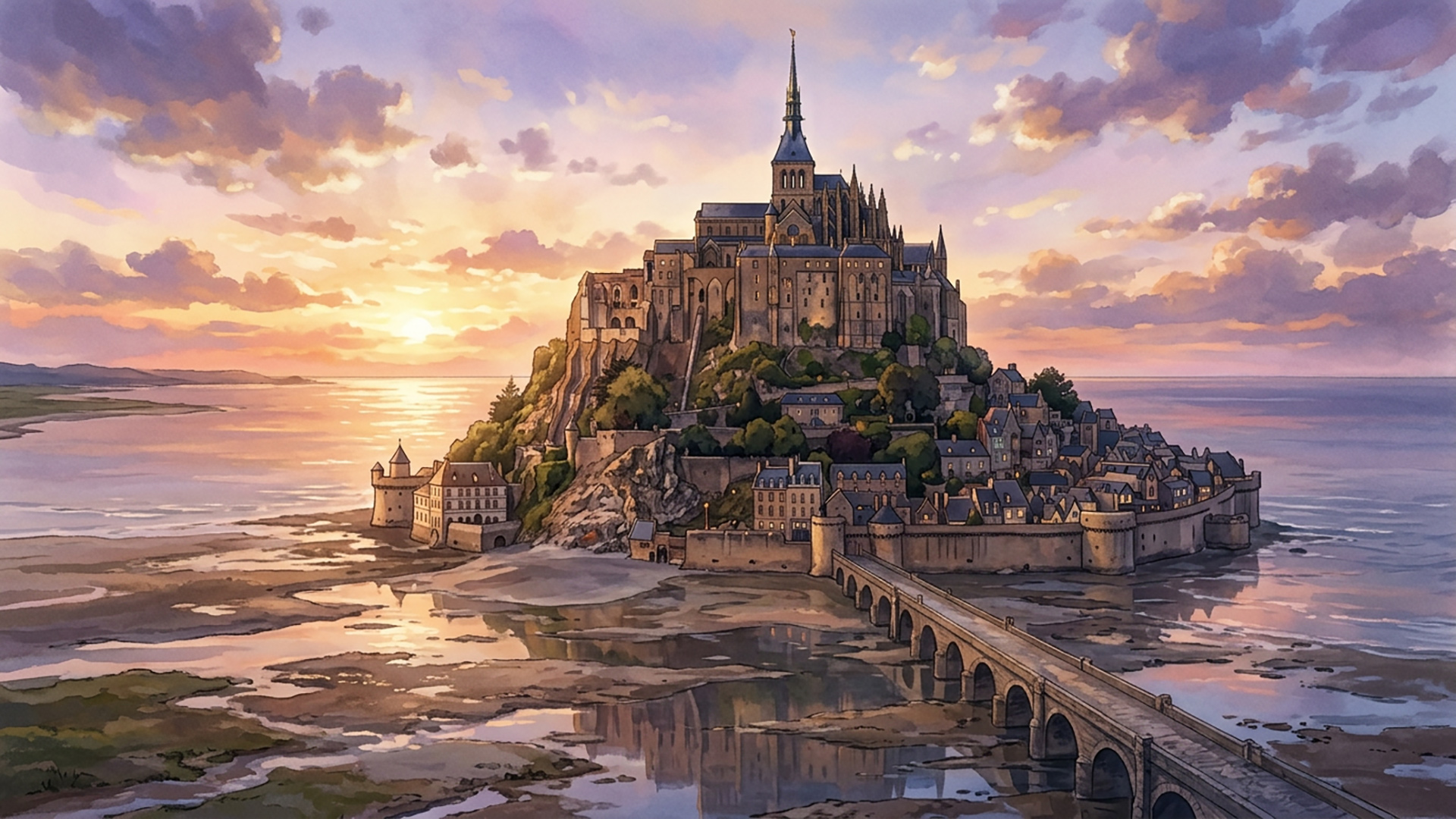 検索キーワード:モン・サン・ミシェル, 海辺の孤島, 修道院, 潮汐, 幻想的, Mont Saint-Michel, island abbey, tidal island, gothic architecture, mystical scenery