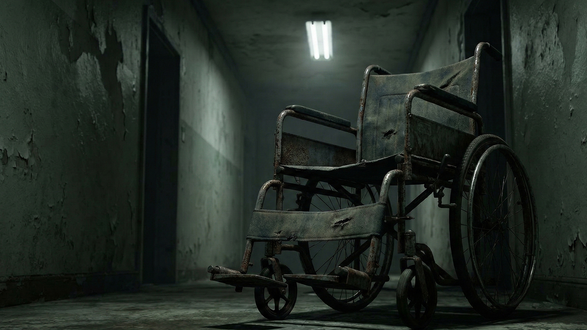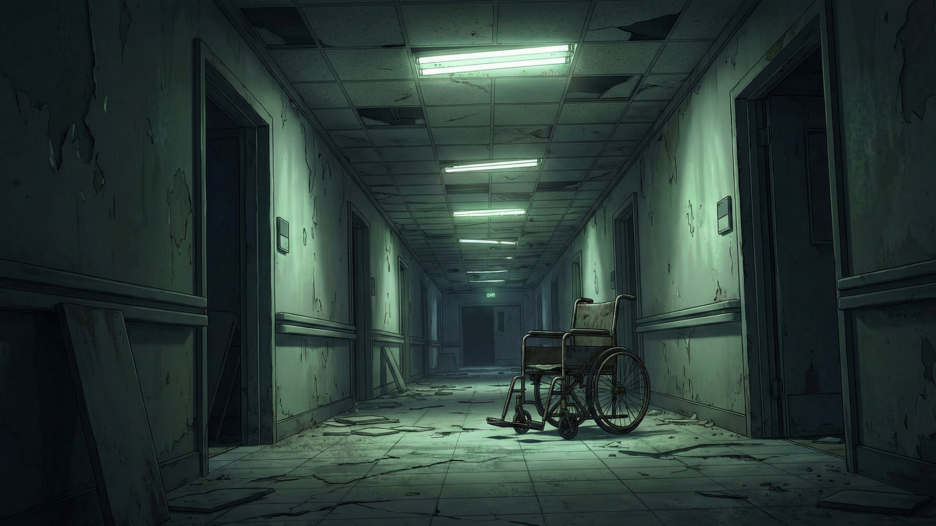 検索キーワード:廃病院, 廃墟, 心霊スポット, 廊下, 車椅子, 点滅, ホラー, 恐怖, 肝試し, 探索, Abandoned hospital, Ruins, Haunted, Creepy, Scary, Corridor, Wheelchair, Flickering lights, Urban exploration, Urbex