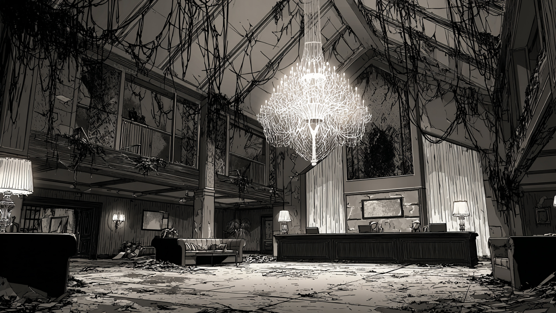 検索キーワード:廃墟, ホテル, ロビー, 静寂, 荒廃, 不穏, ruins, hotel, lobby, silence, decay, eerie