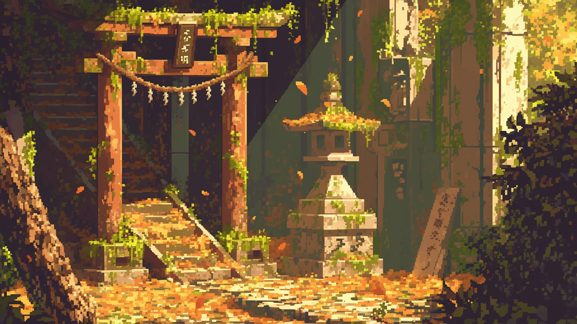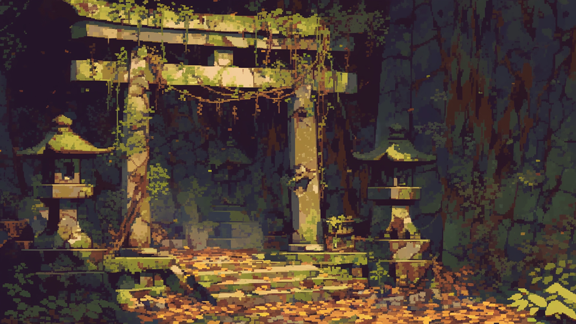 検索キーワード:廃れた, 神社, 鳥居, 苔, 静寂, ドット絵, abandoned, shrine, torii, moss, silence, pixel art