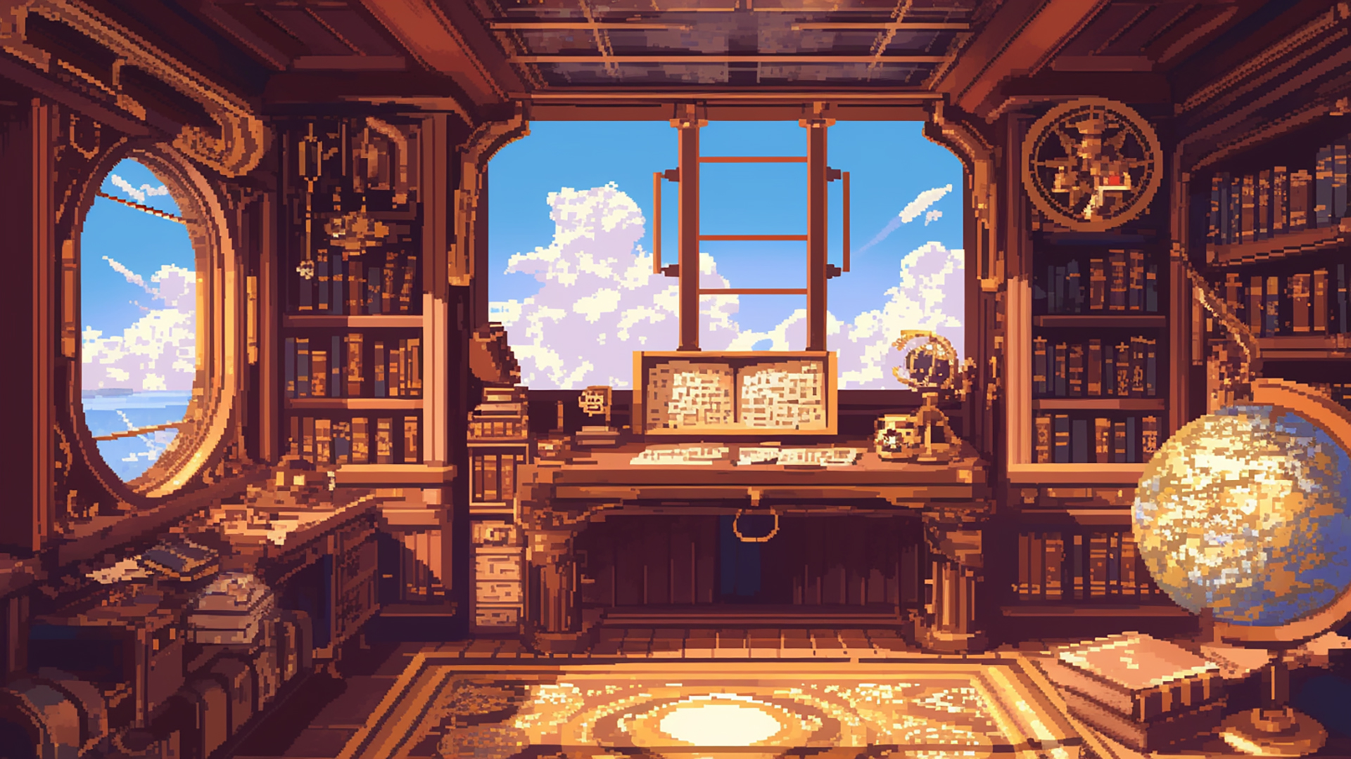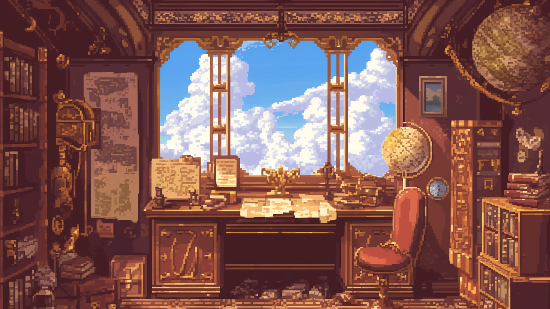 検索キーワード:飛行船, 船長室, 机, 窓, ファンタジー, ドット絵, airship, captain’s cabin, desk, window, fantasy, pixel art