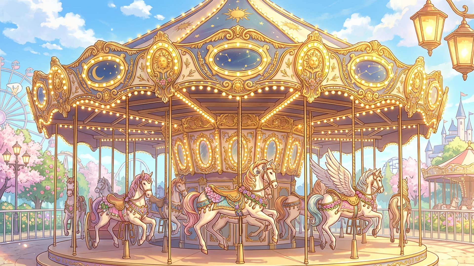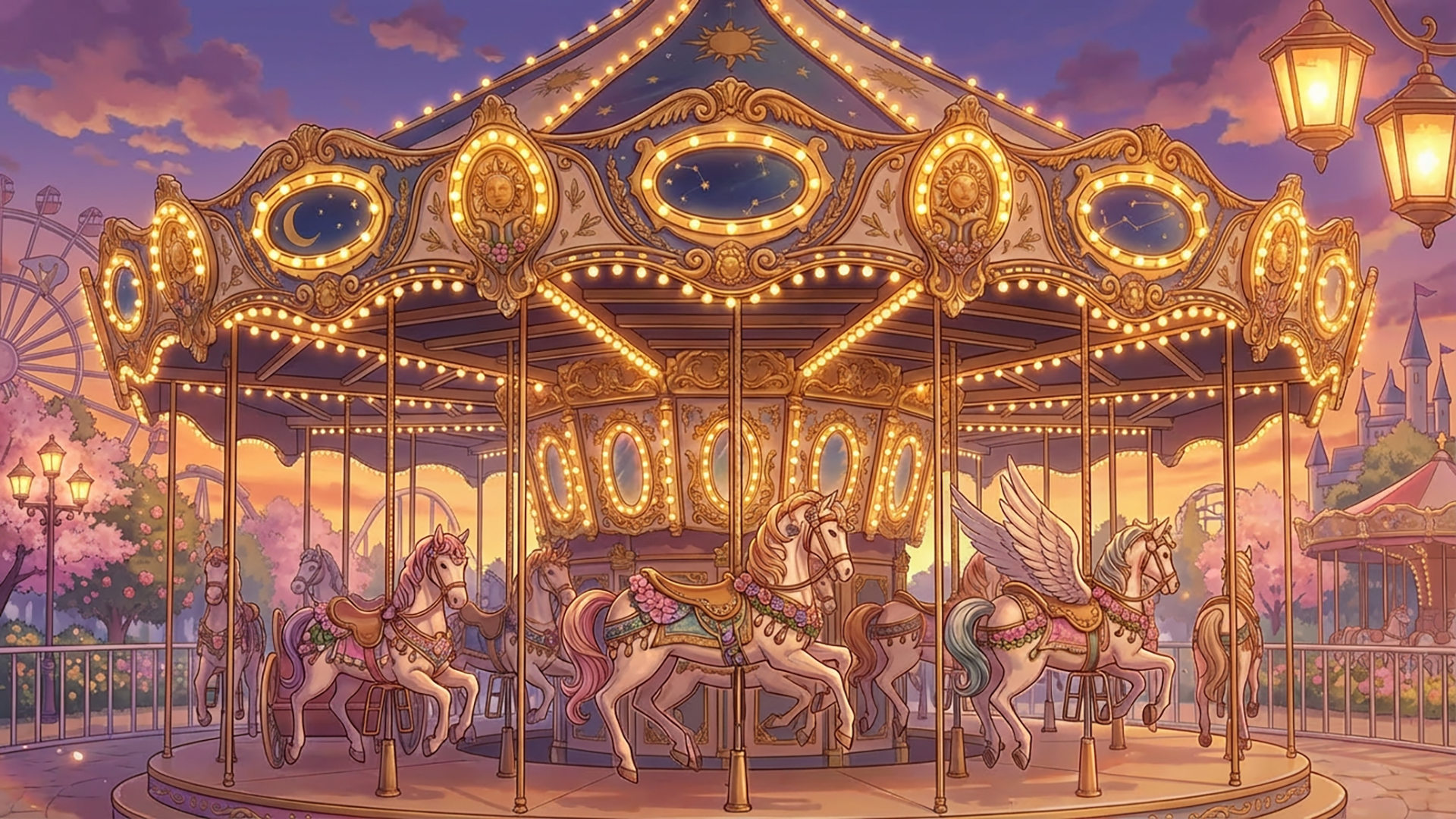 検索キーワード:遊園地,メリーゴーランド,回転遊具,装飾,ライト,差分, amusement park, carousel, merry-go-round, decoration, lights, variations