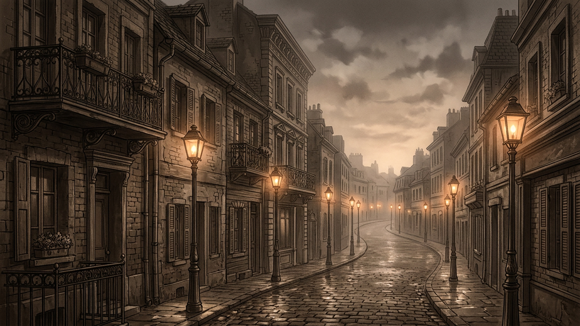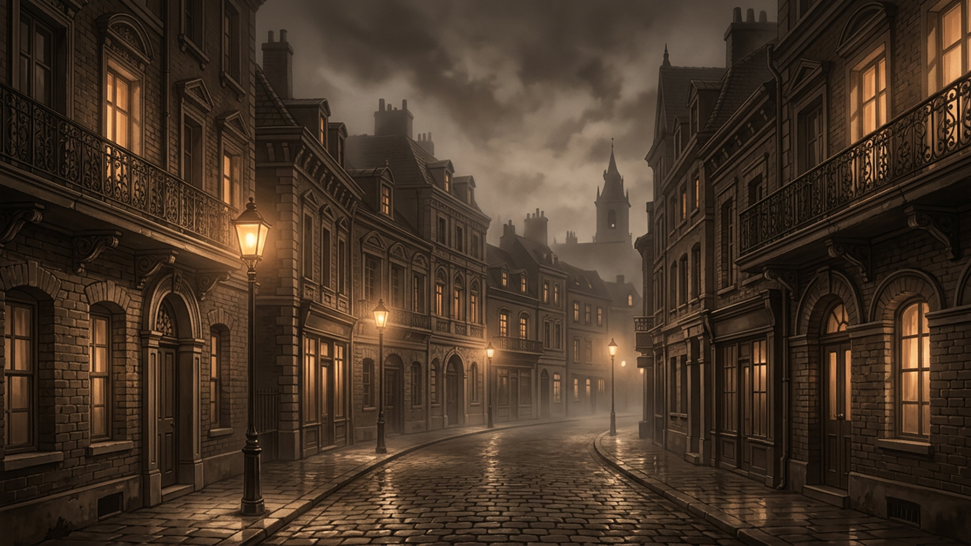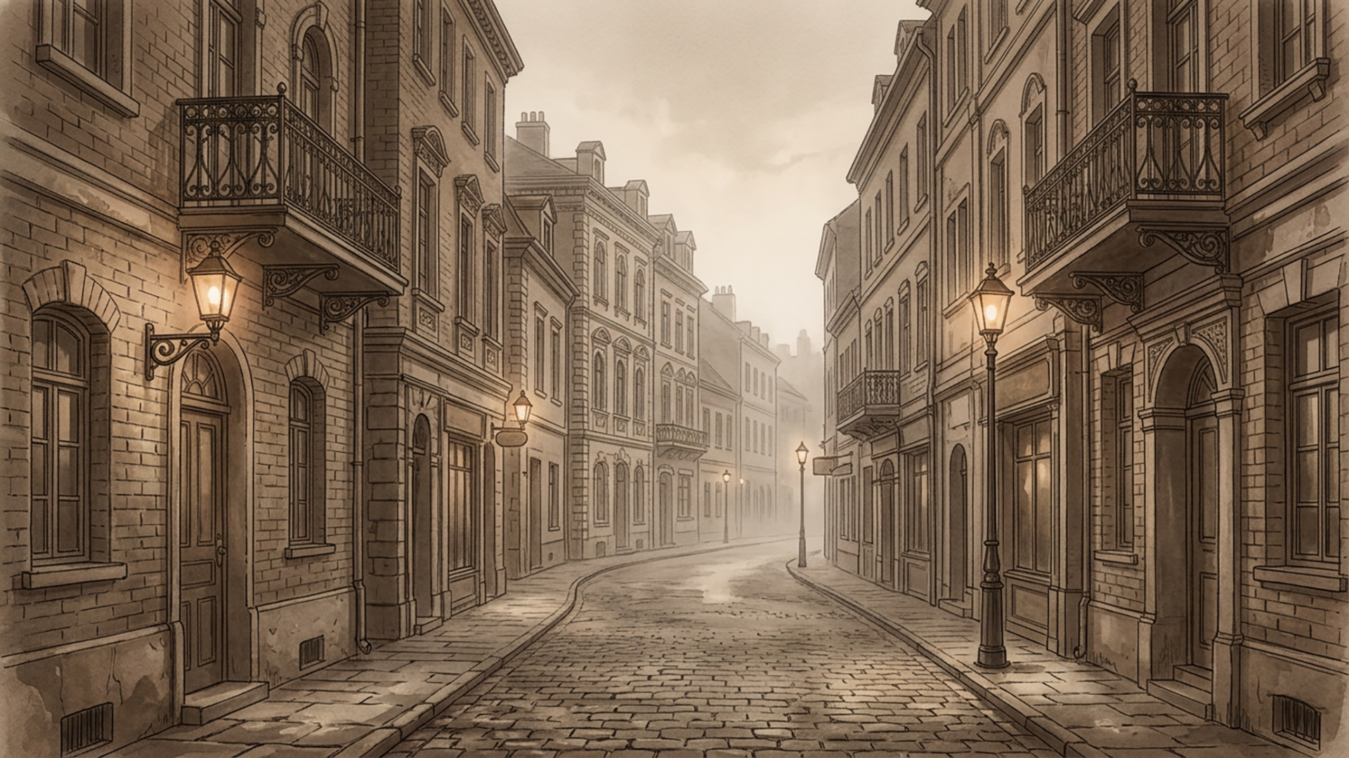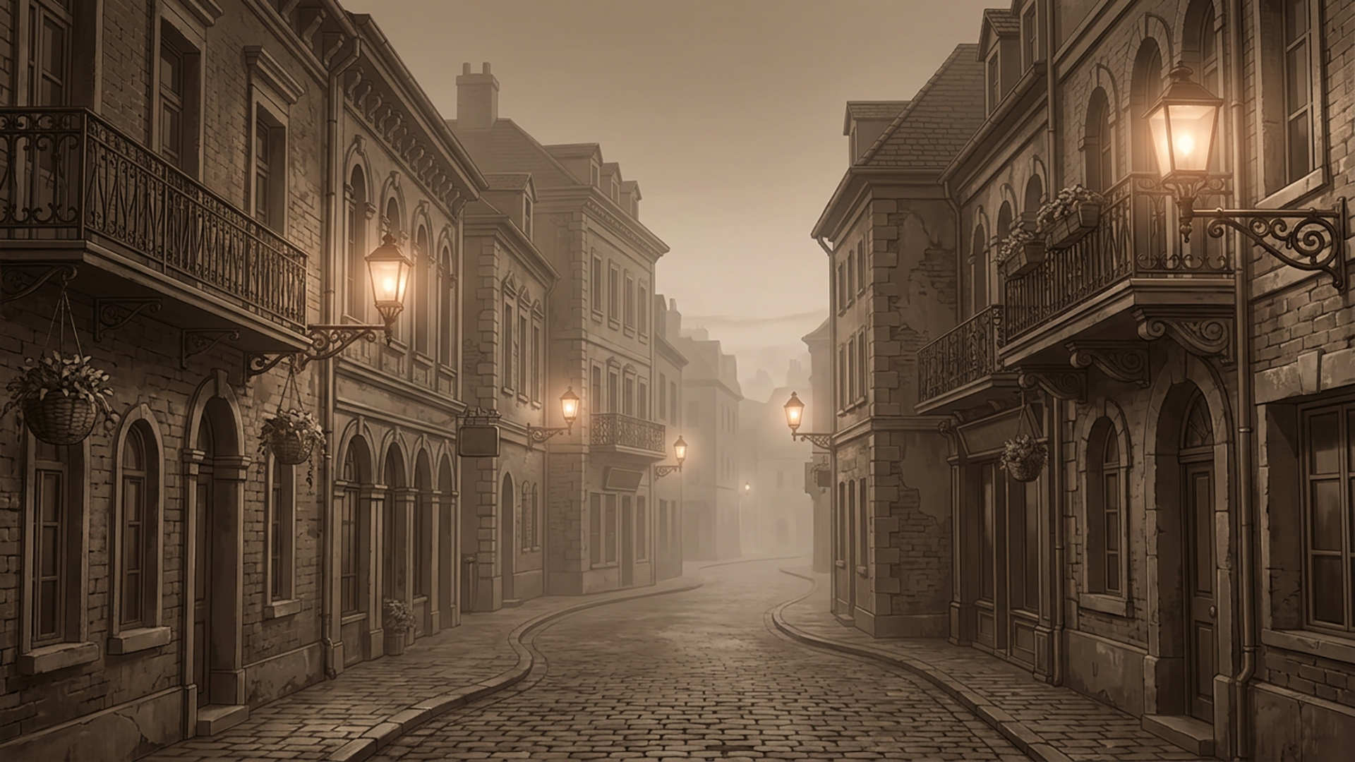 検索キーワード:霧の街, レンガ通り, セピア, レトロ, ノスタルジー, foggy city, brick street, sepia tone, retro landscape, nostalgia