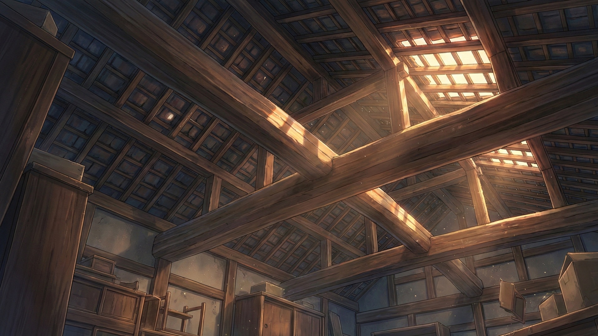 検索キーワード:温泉旅館, 屋根裏, 梁, 建築, 木造建築, 古民家, 隠れ家, 歴史的建造物, 構造美, 伝統美, Onsen ryokan, Attic, Beam, Architecture, Wooden structure, Old folk house, Hideaway, Historical building, Structural beauty, Traditional Japanese architecture