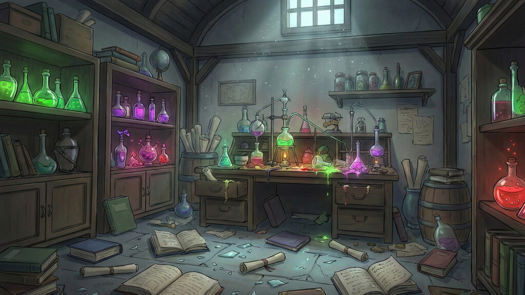 怪しい色の薬瓶や本が散乱している錬金術師の研究室(3枚)