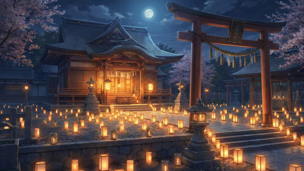 ろうそくの火が揺れる夜の神社の境内(3枚)