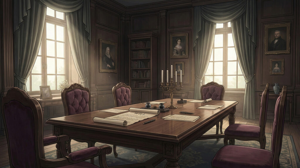遺言書の読み上げが行われる厳粛な屋敷の応接間(3枚)