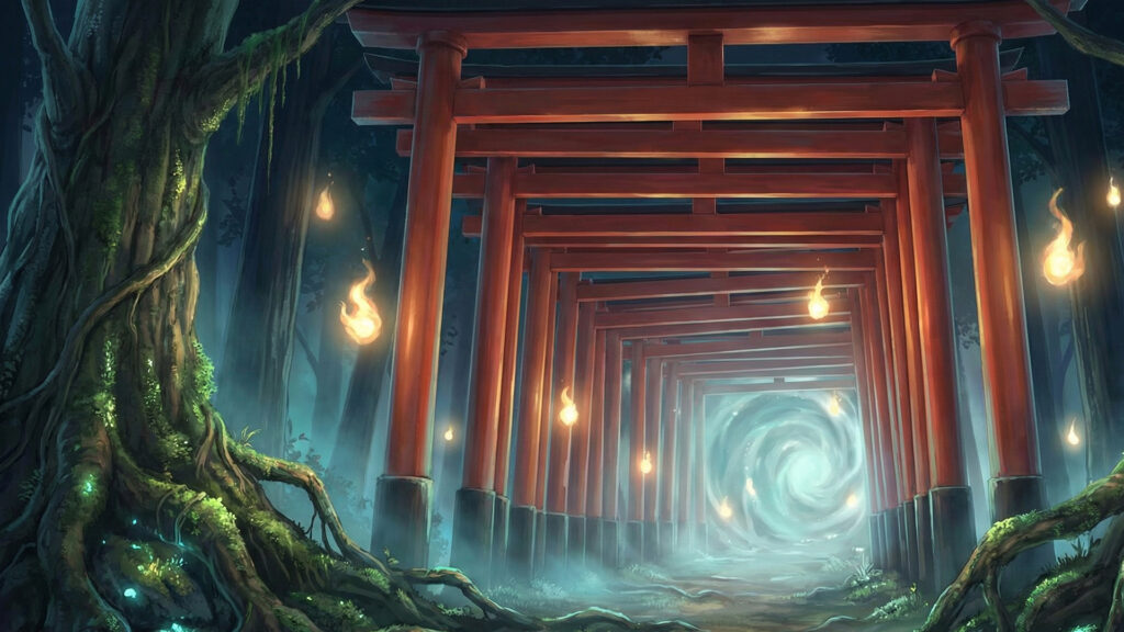異界に繋がっていそうな朱色の鳥居のトンネル(3枚)
