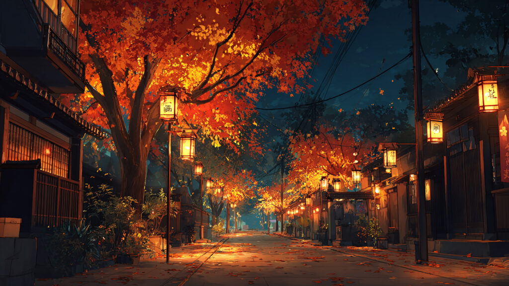 夜の紅葉通り|提灯が灯る和風シーン(3枚)