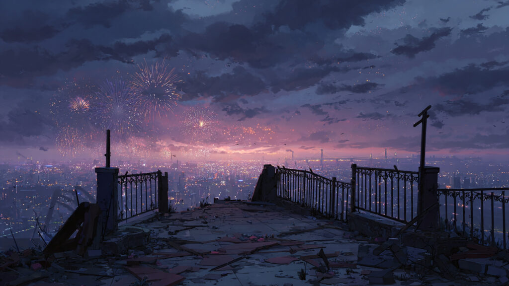 廃墟ビル屋上と花火|不気味で美しい夜(3枚)