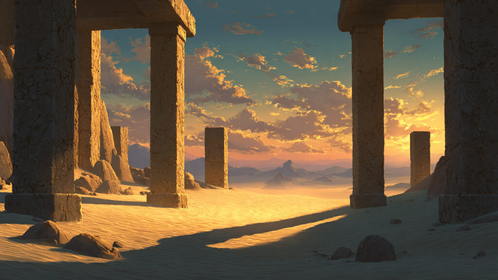 砂漠の神殿と初日の出|異世界・冒険・神秘的な朝(3枚)