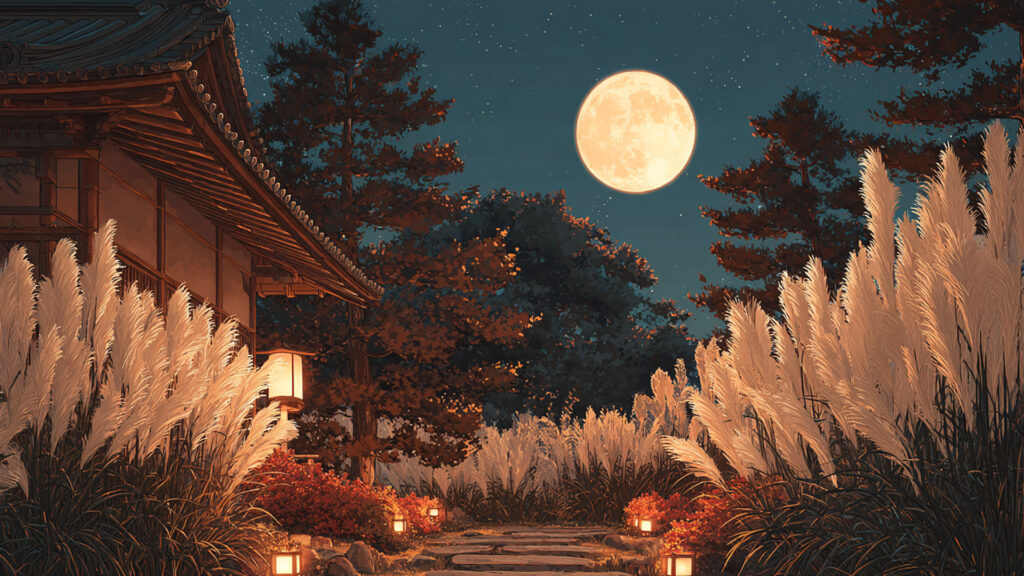 月見の庭園|ススキと満月の夜(3枚)