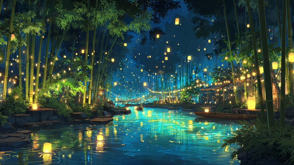 七夕の川辺|笹飾りと灯籠流し(3枚)