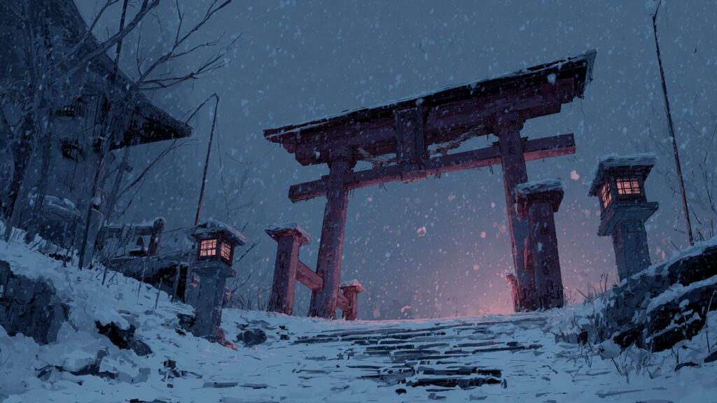 雪の神社と鳥居|冬の和風シーン(3枚)