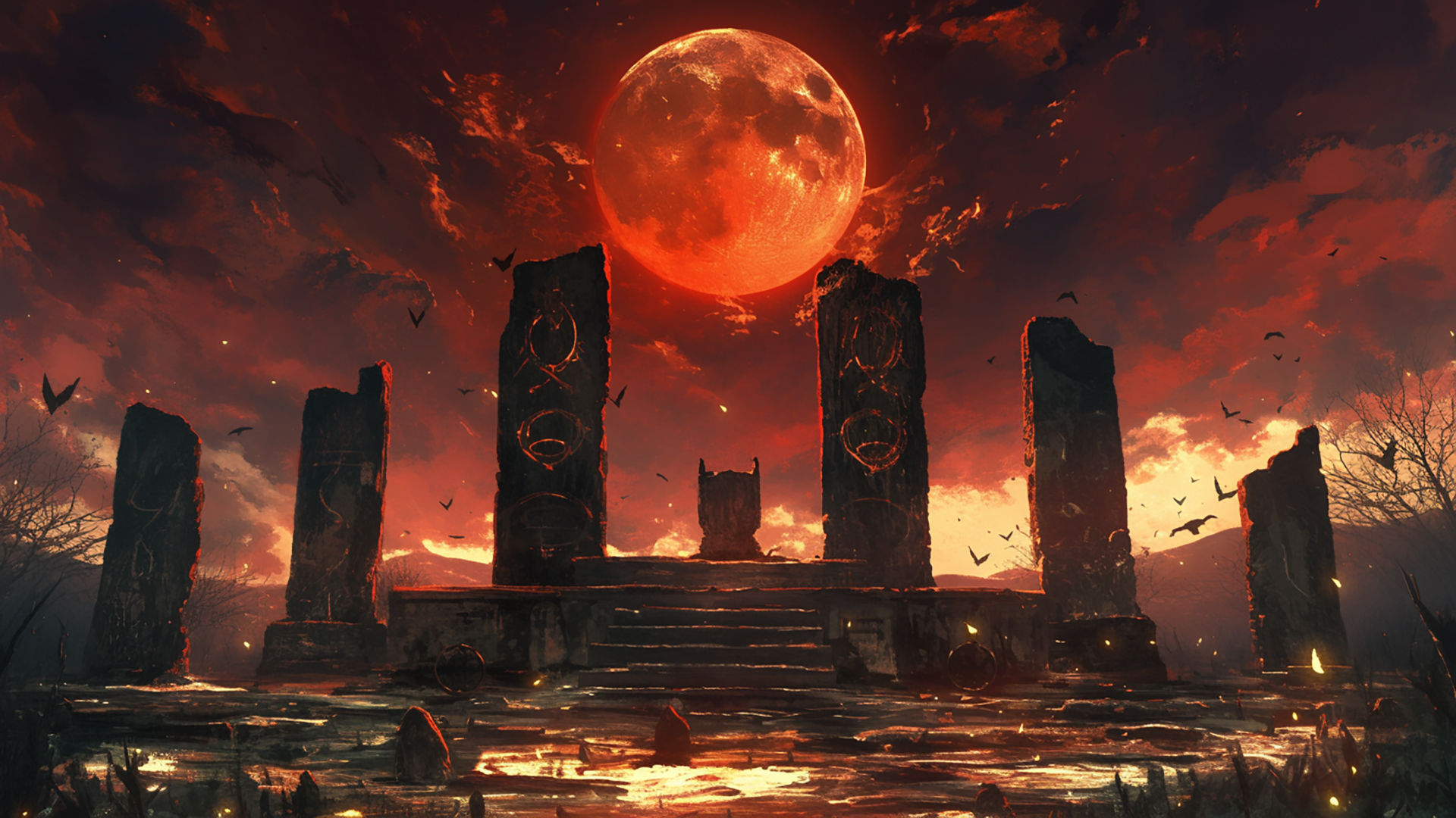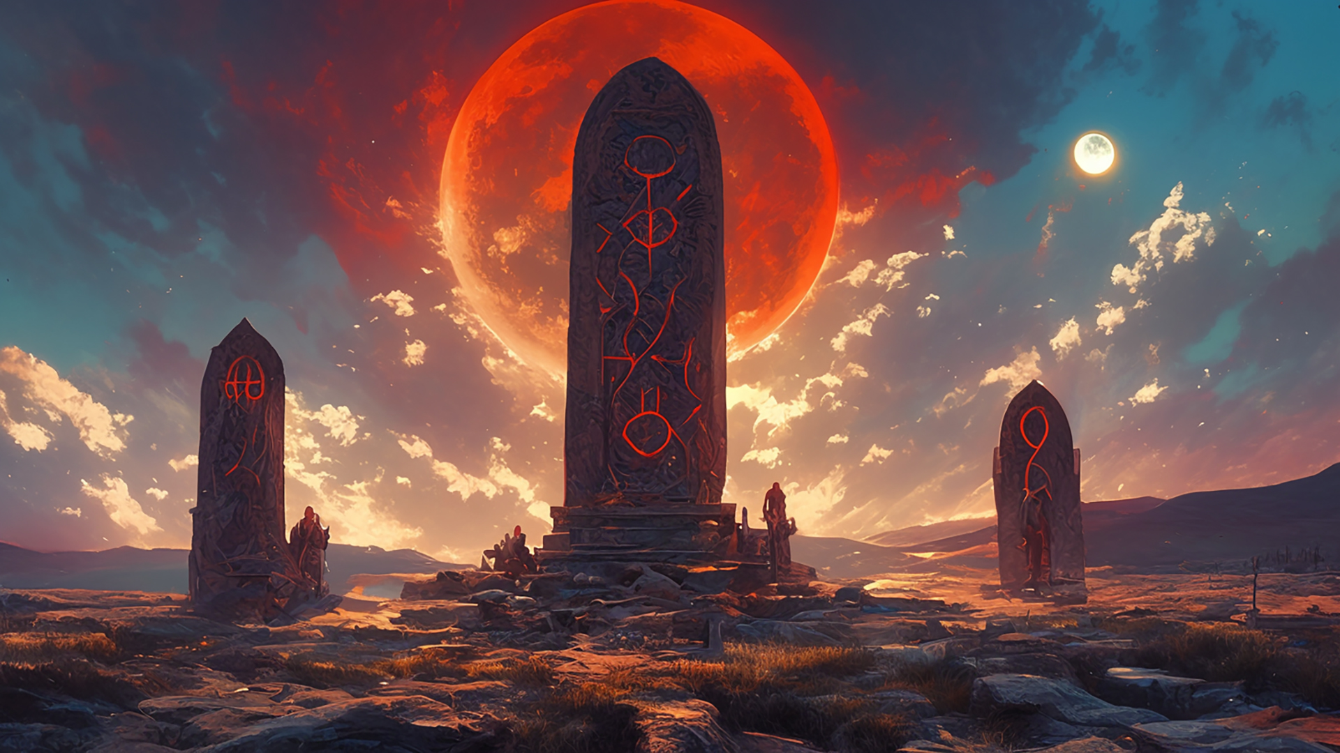 ケルトの月食の儀式|赤い月と祭壇の神秘的背景素材(3枚)