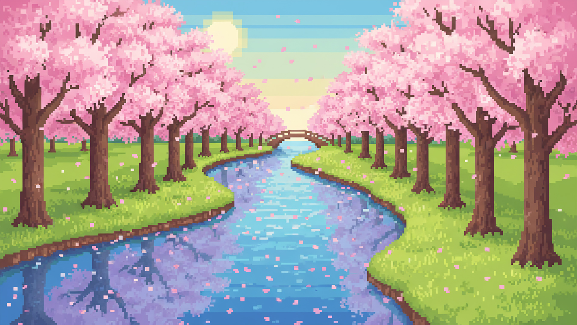 検索キーワード:桜並木, 川沿い, ドット絵, 春, 水辺, レトロ, Rows of Cherry Trees, Riverside, Pixel Art, Spring, Waterside, Retro