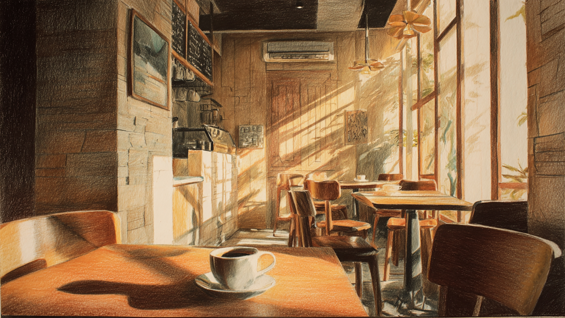 検索キーワード:色鉛筆, カフェ, 手描き, 温かい, 室内, 風景, coloredpencil, cafe, handdrawn, warm, interior, scenery