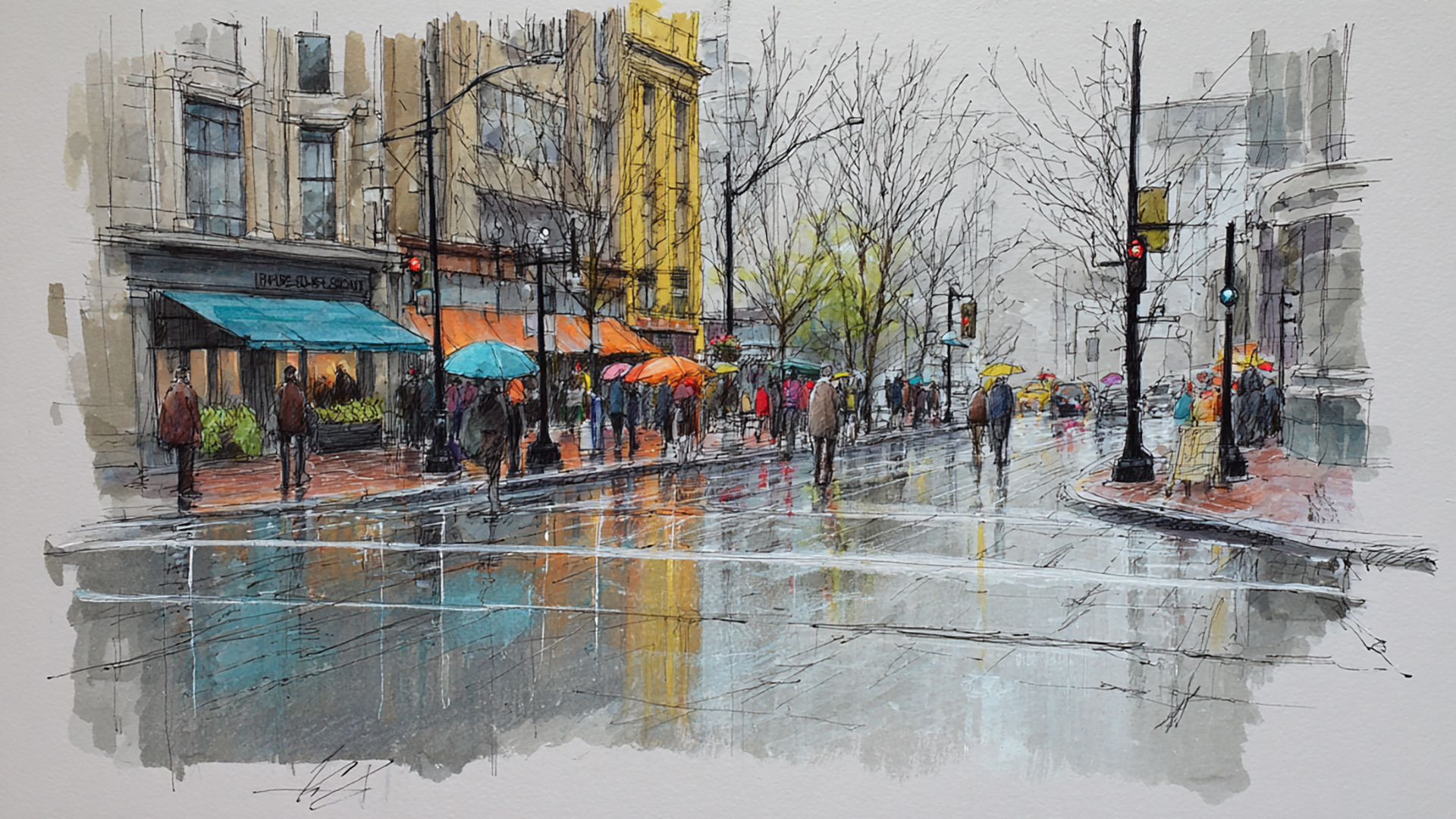色鉛筆風-雨の日の傘|手描き風のしっとり風景_心象風景