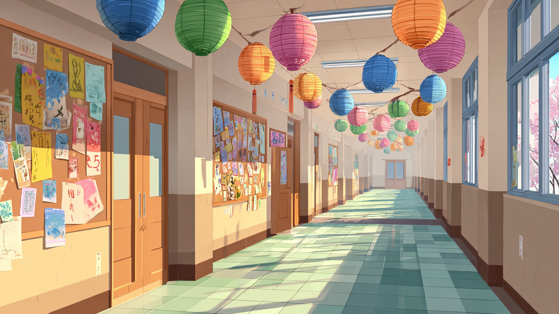 検索キーワード:文化祭, 廊下, 提灯, 飾り付け, 賑やか, 学校, school festival, hallway, lanterns, decorations, lively, school