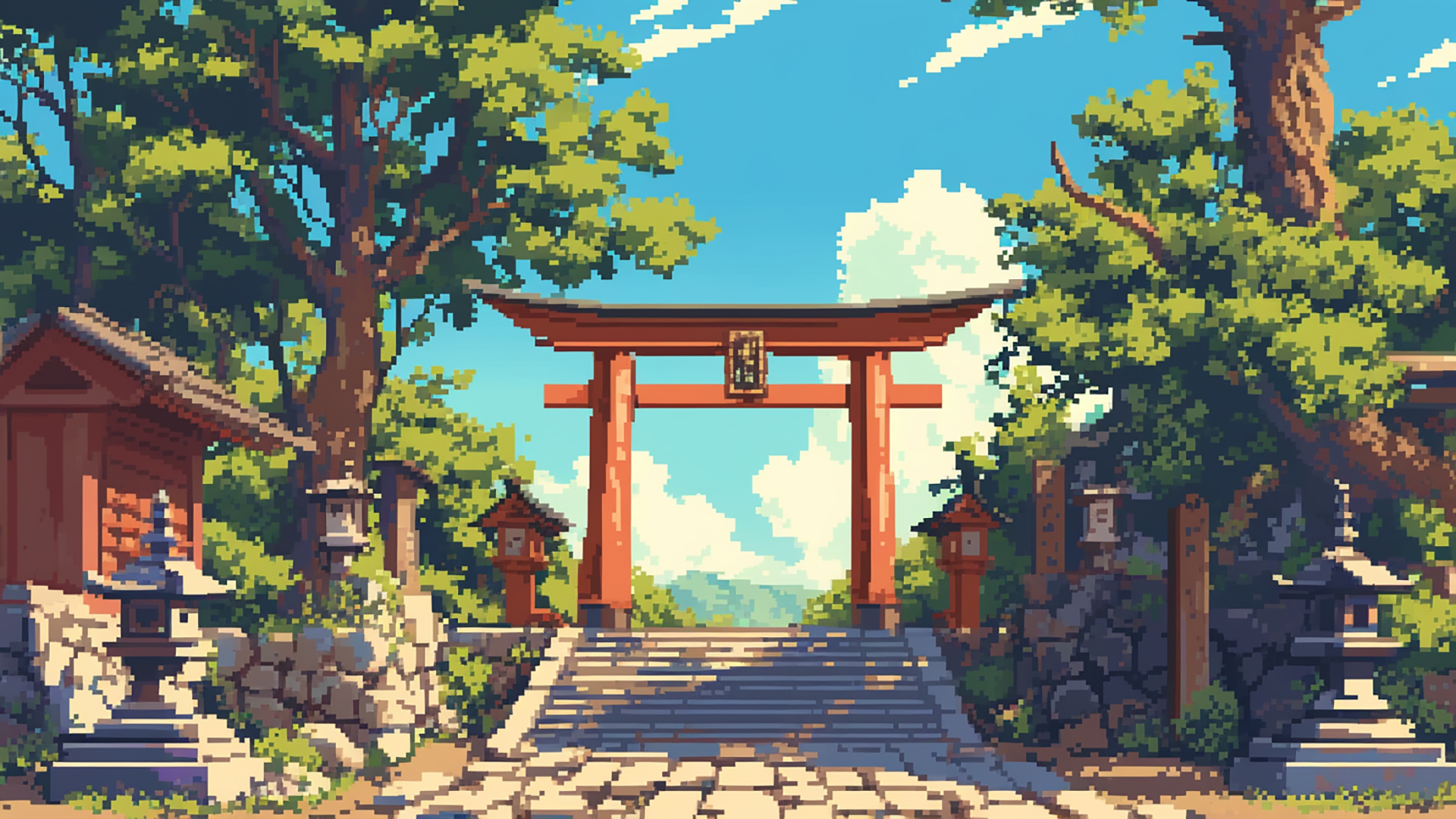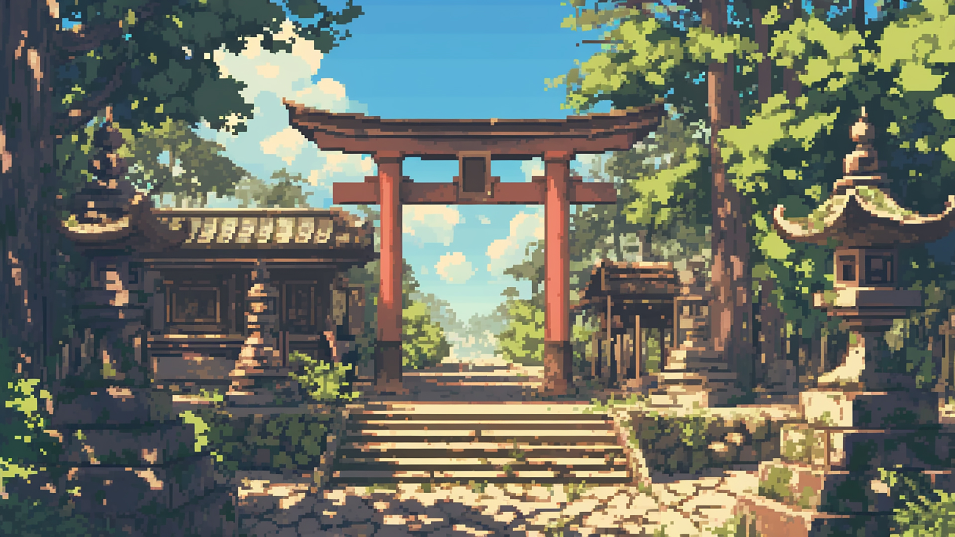 検索キーワード:神社, 昼, 鳥居, 石段, 森, ドット絵, shrine, daytime, torii, stone steps, forest, pixel art
