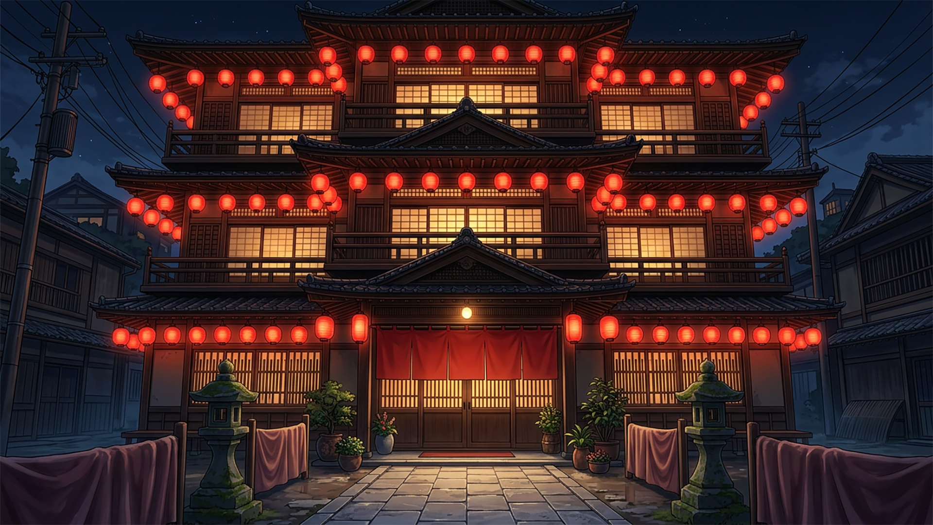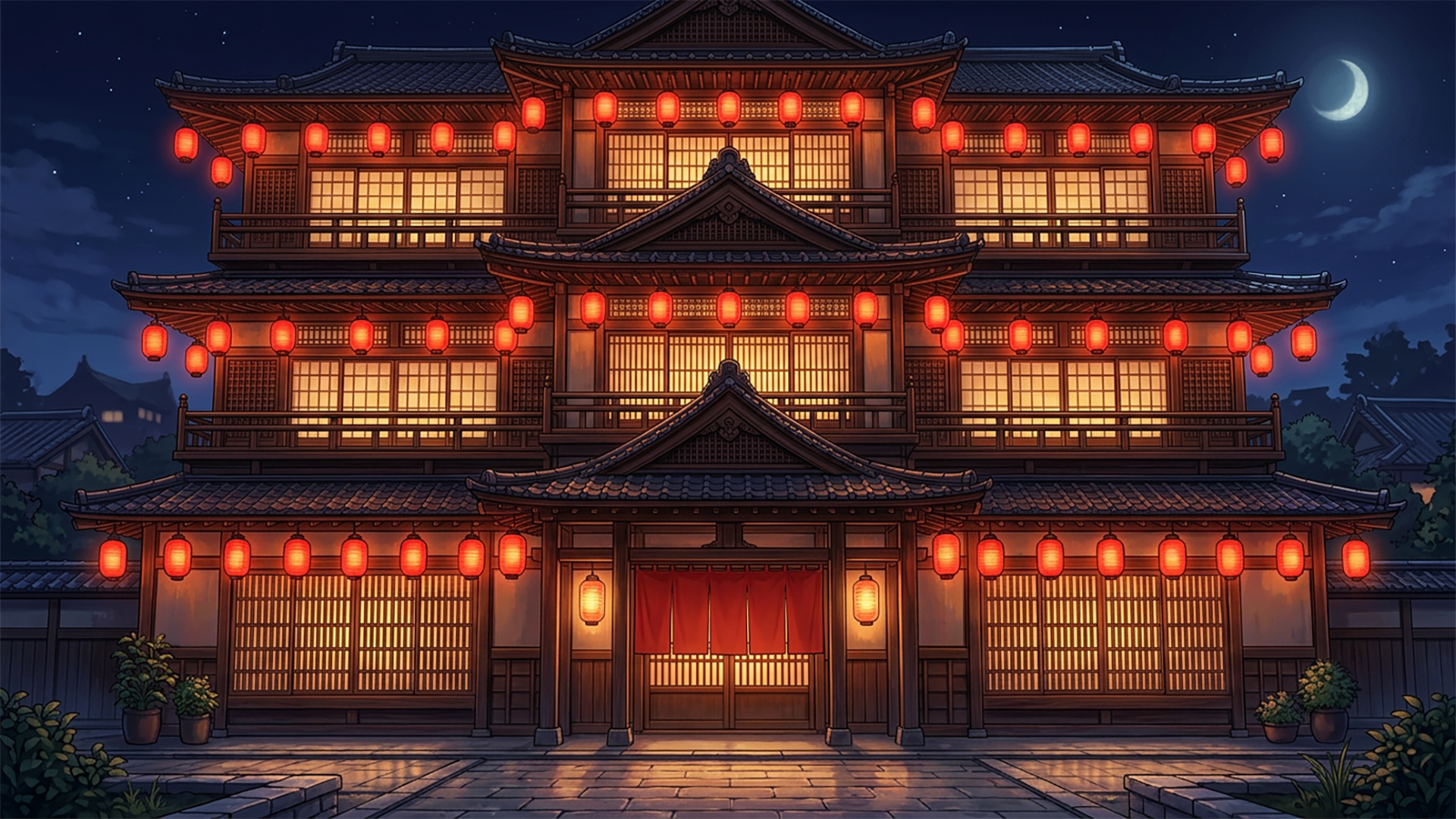 検索キーワード:遊郭, 外観, 江戸時代, 花街, 格子, 夜景, Pleasure Quarter, Exterior, Historical Japan, Courtesan District, Latticework, Night Scene