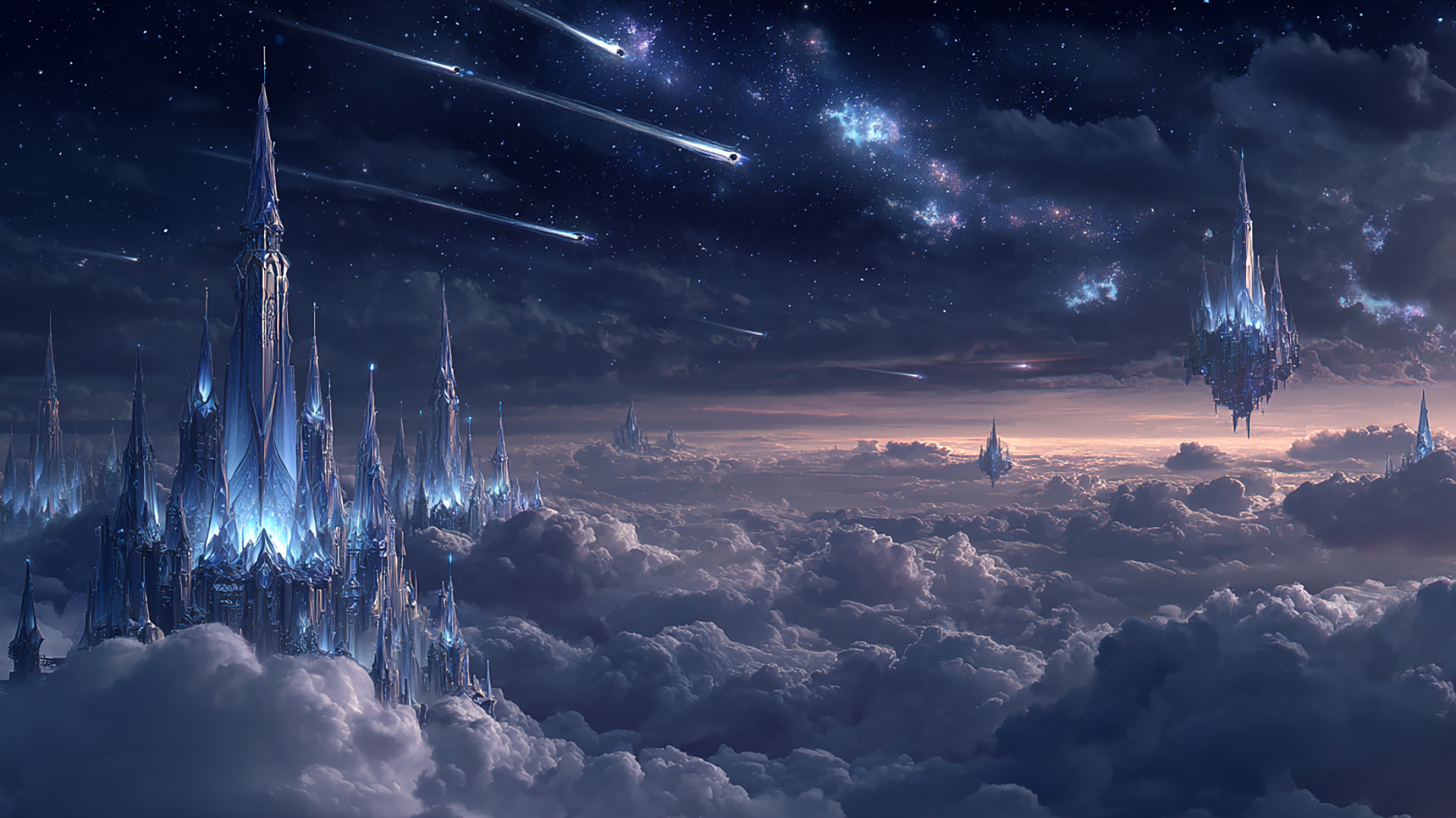 空に浮かぶ都市と流星群|異世界・天空都市・夜空(3枚)