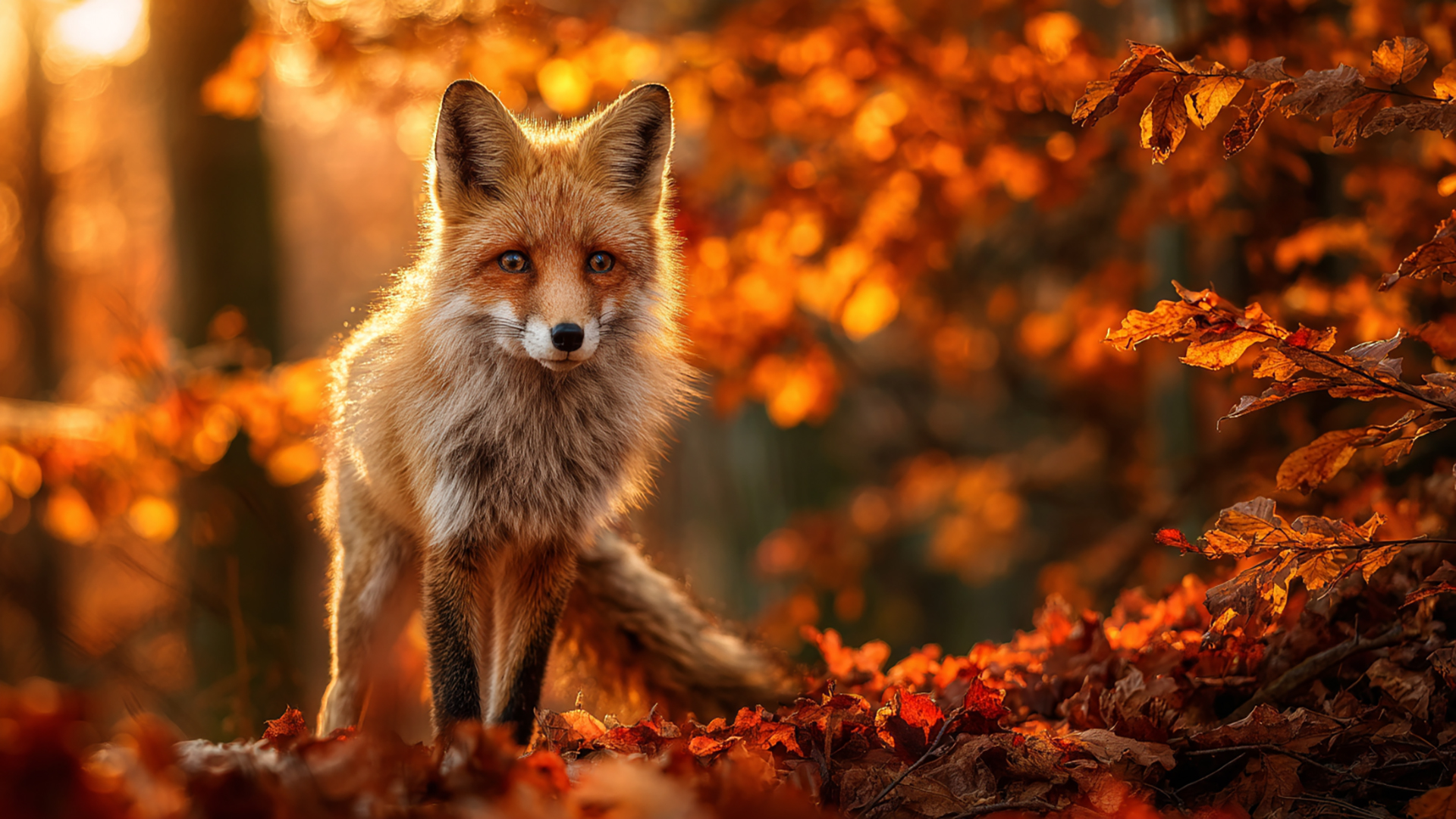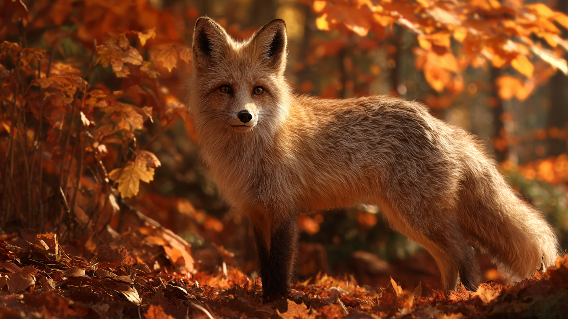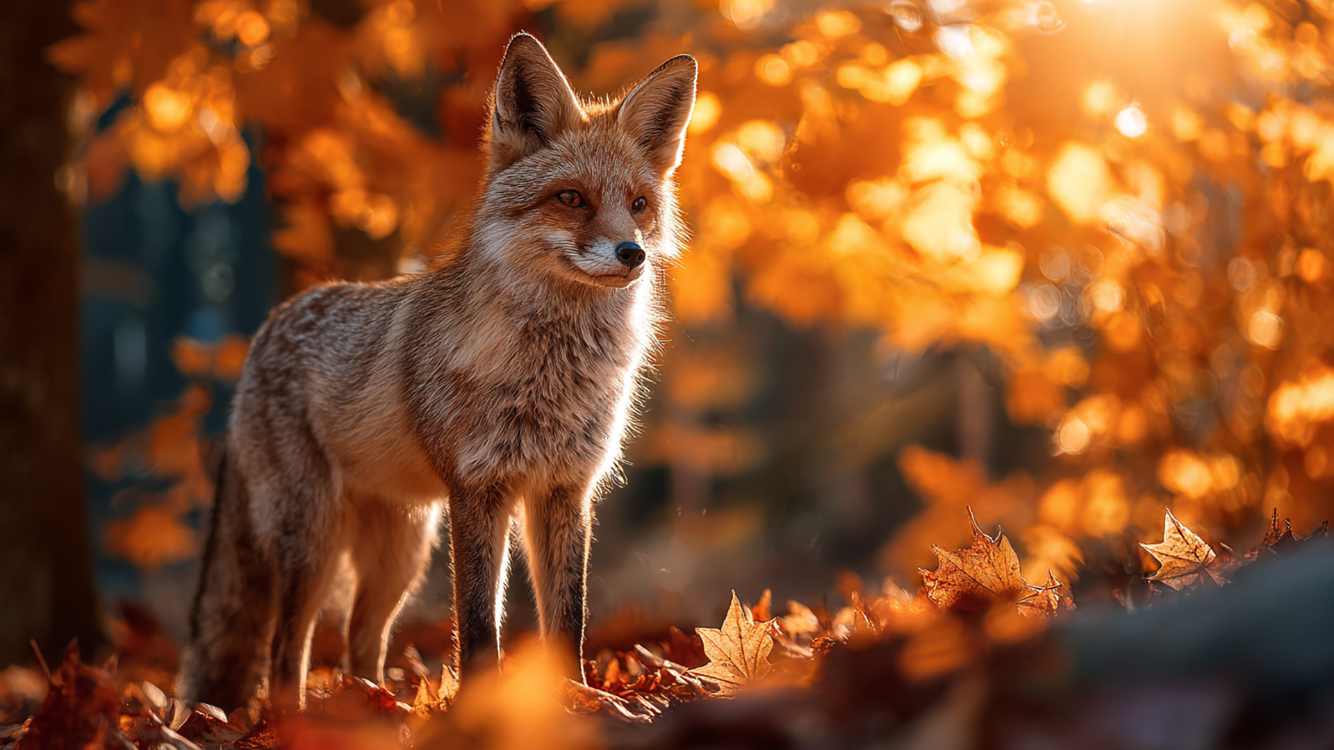 検索キーワード:秋の森, キツネ, 写実風, 落ち葉, 静寂, 自然, autumn forest, fox, realistic, fallen leaves, silence, nature