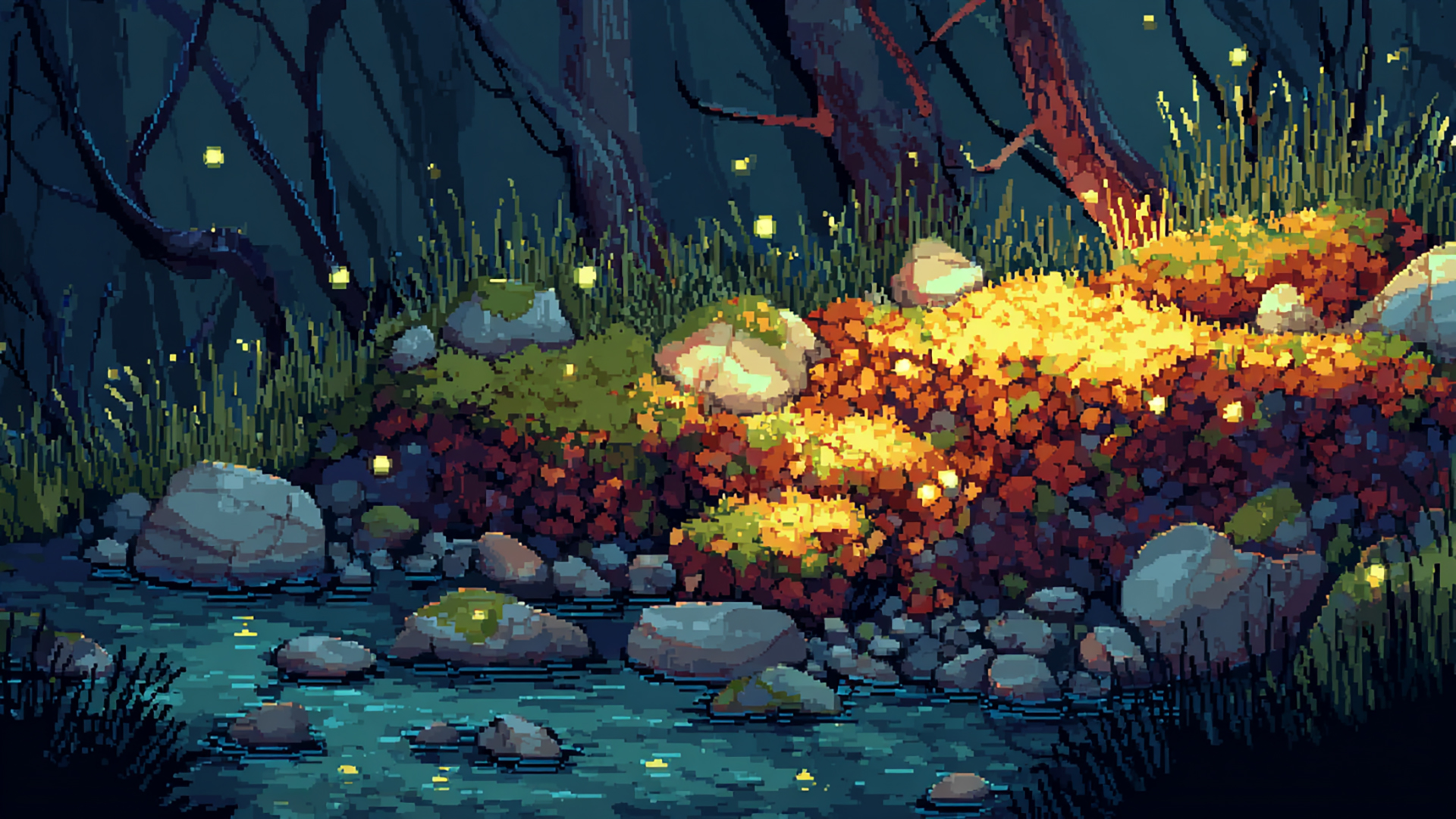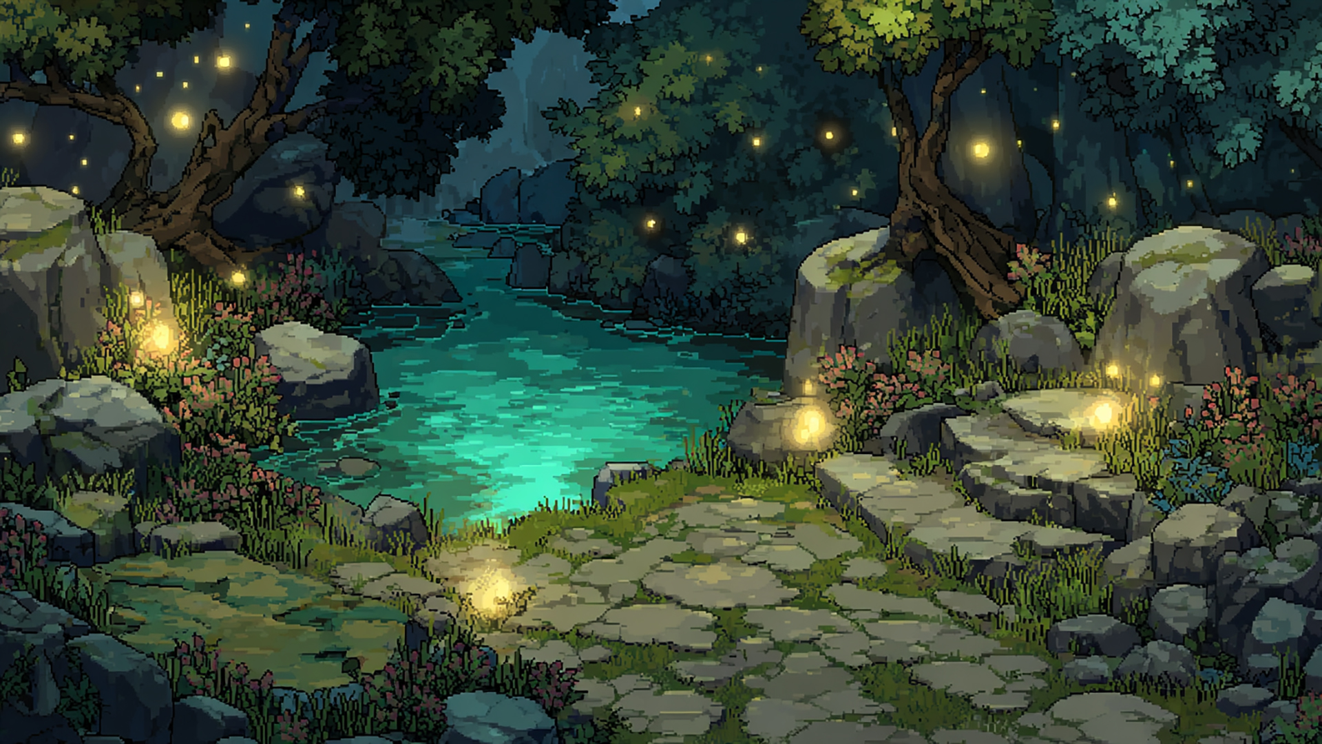 検索キーワード:光る, 河原, ほとり, ファンタジー, ドット絵, 夜, glowing, riverside, shore, fantasy, pixel art, night