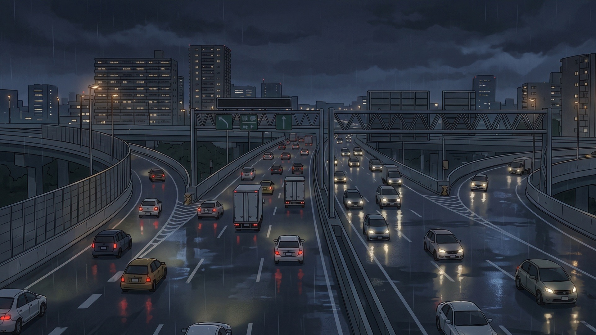 検索キーワード:雨, 高速道路, ドライブ, 雨天走行, 車窓, ヘッドライト, 安全運転, 景色, ハイウェイ, 雨の日, rain, expressway, highway, driving, rainy day, wet road, car, dashboard view, road trip, night drive