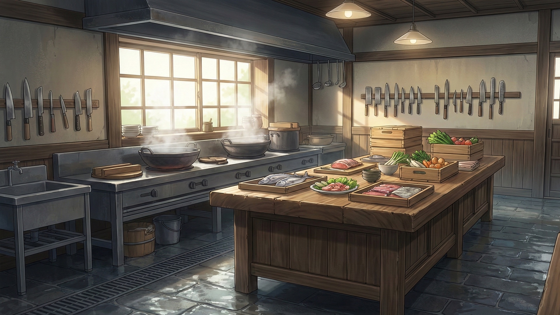 検索キーワード:温泉旅館, 板場, 厨房, 板前, 料理人, 日本料理, 和食, 調理場, おもてなし, 舞台裏, Onsen ryokan, Professional kitchen, Itaba, Chef, Itamae, Japanese cuisine, Washoku, Cooking area, Hospitality, Behind the scenes