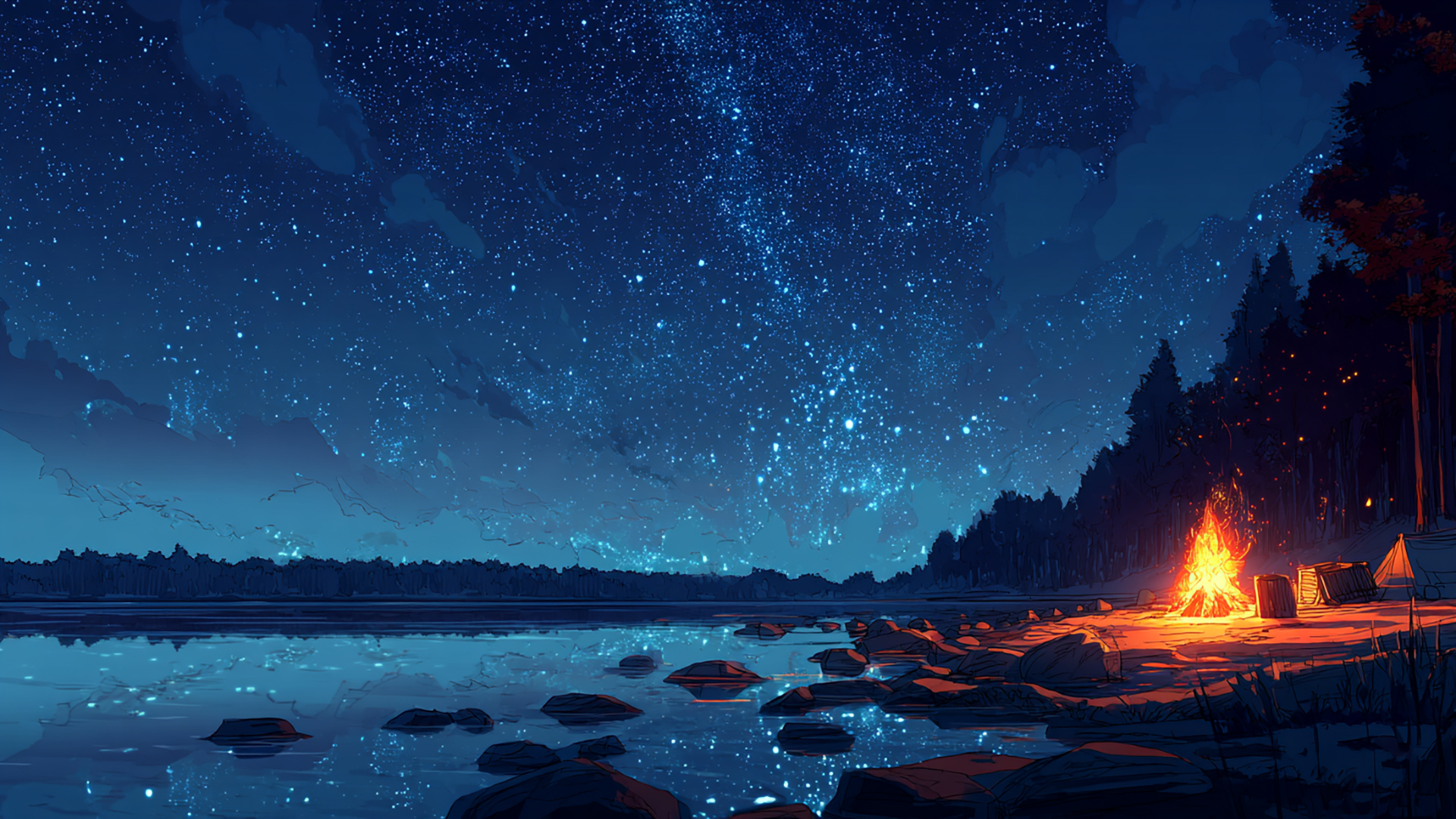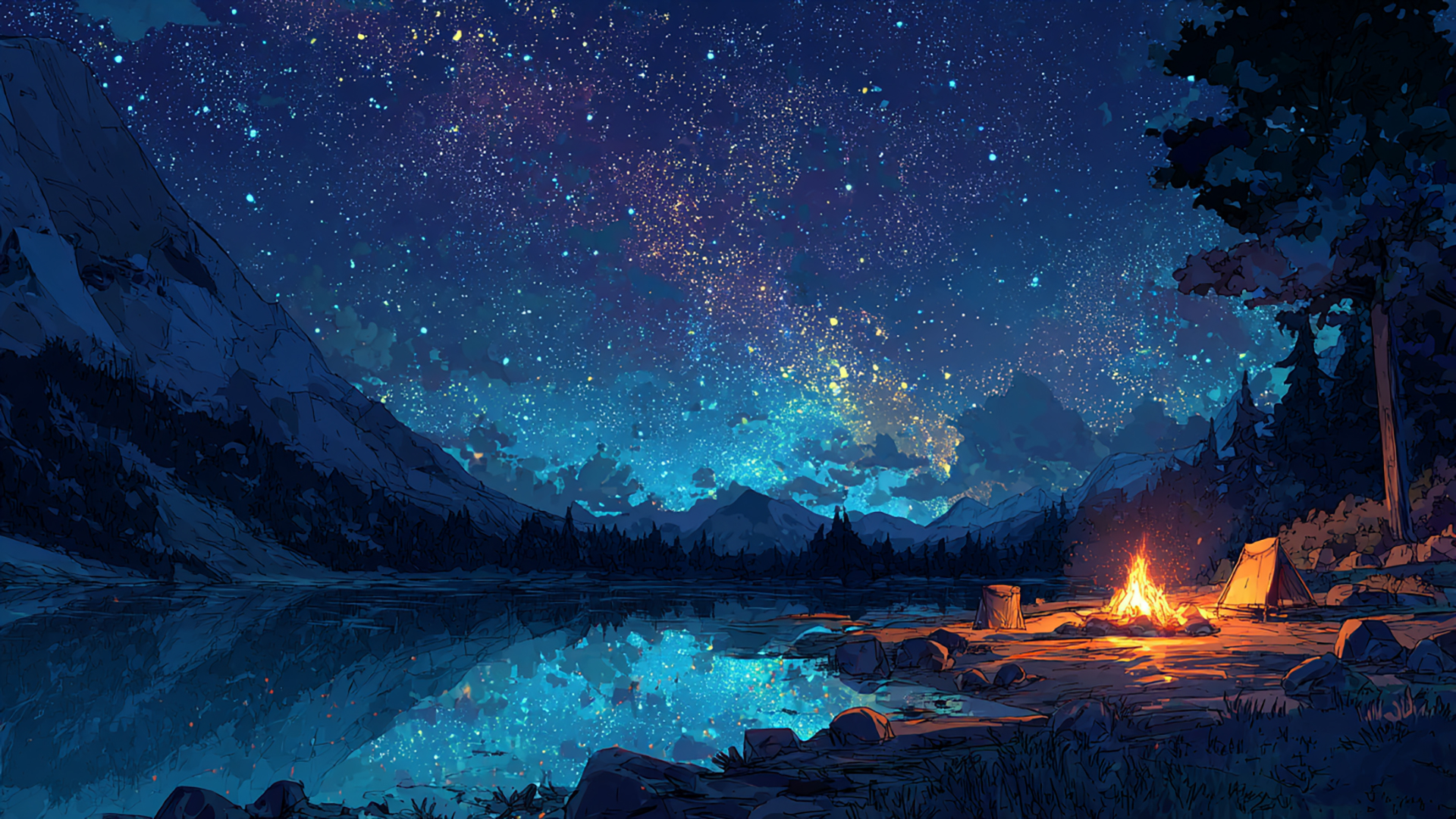 検索キーワード:湖畔, キャンプ, 星空, ファンタジー, 冒険, 旅の休息, lakeside, camp, starry sky, fantasy, adventure, journey rest