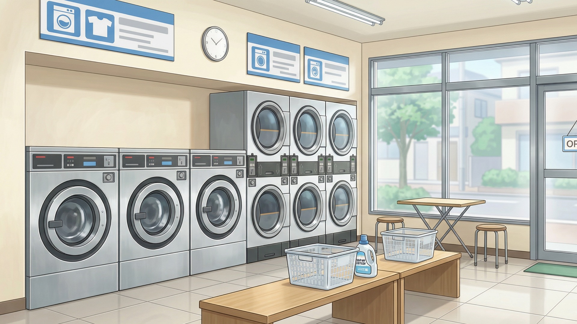 検索キーワード:コインランドリー, 洗濯, 乾燥機, 生活感, 日常, 待ち時間, 家事, 清潔感, 無人店舗, 夜間, Laundromat, Laundry, Self-service laundry, Washing machine, Dryer, Daily life, Chore, Routine, Urban life, 24 hours