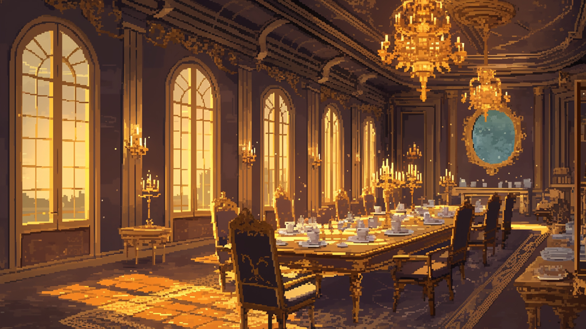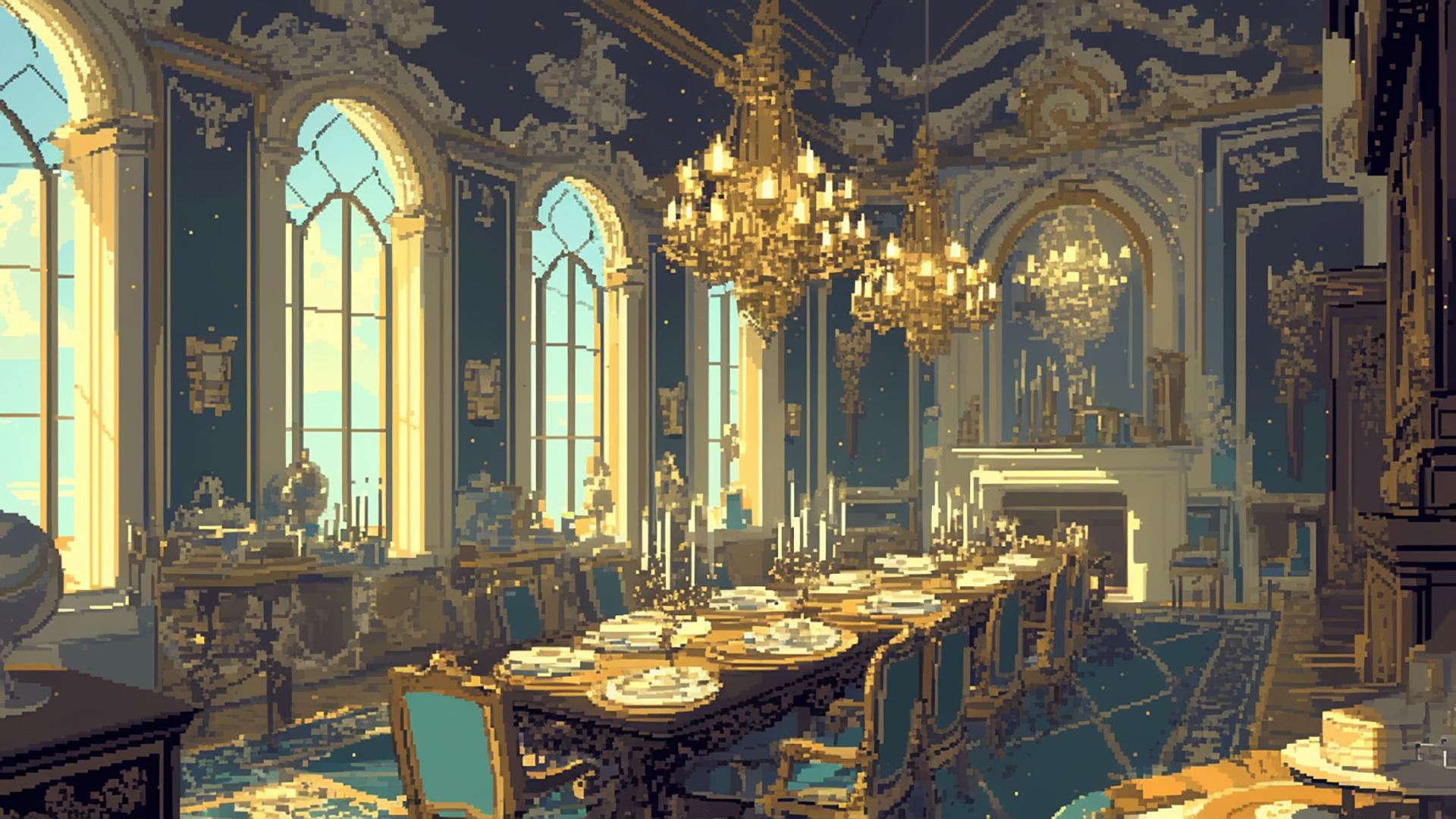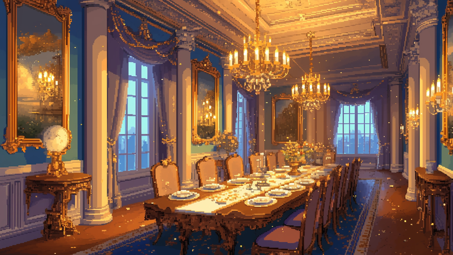 検索キーワード:お屋敷, ダイニングルーム, 豪華, 食卓, ファンタジー, ドット絵, mansion, dining room, luxurious, table, fantasy, pixel art