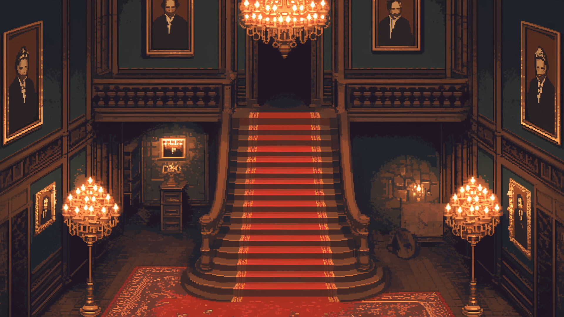 検索キーワード:お屋敷, エントランス, 豪華, ファンタジー, ドット絵, 建築, mansion, entrance, luxurious, fantasy, pixel art, architecture