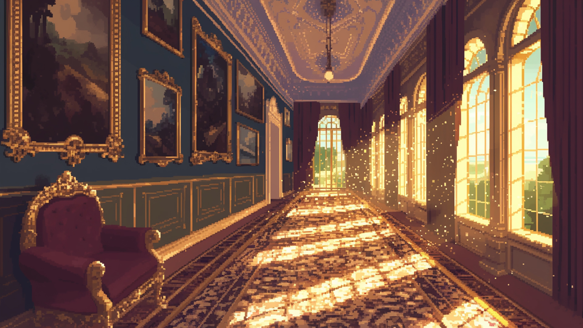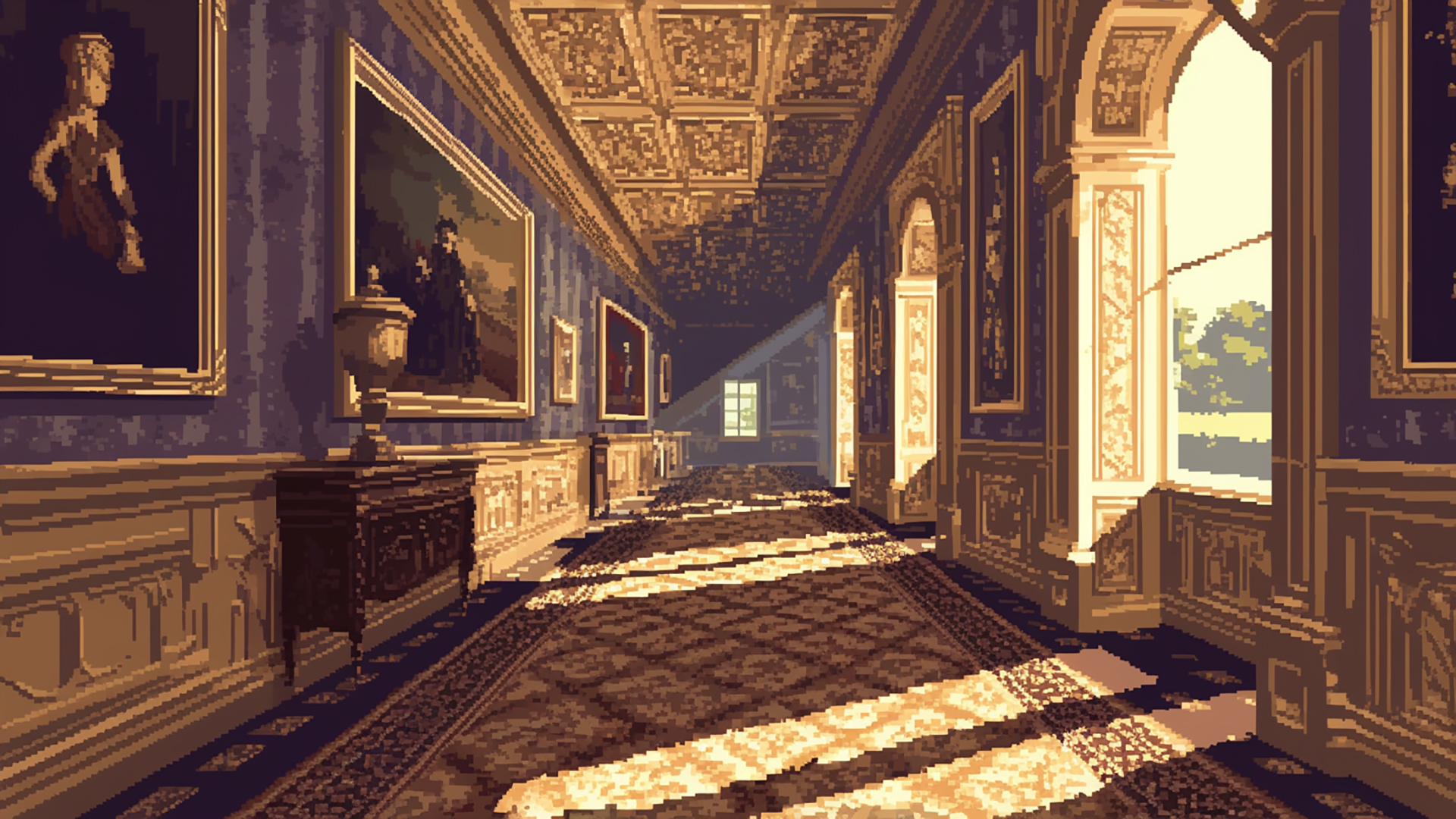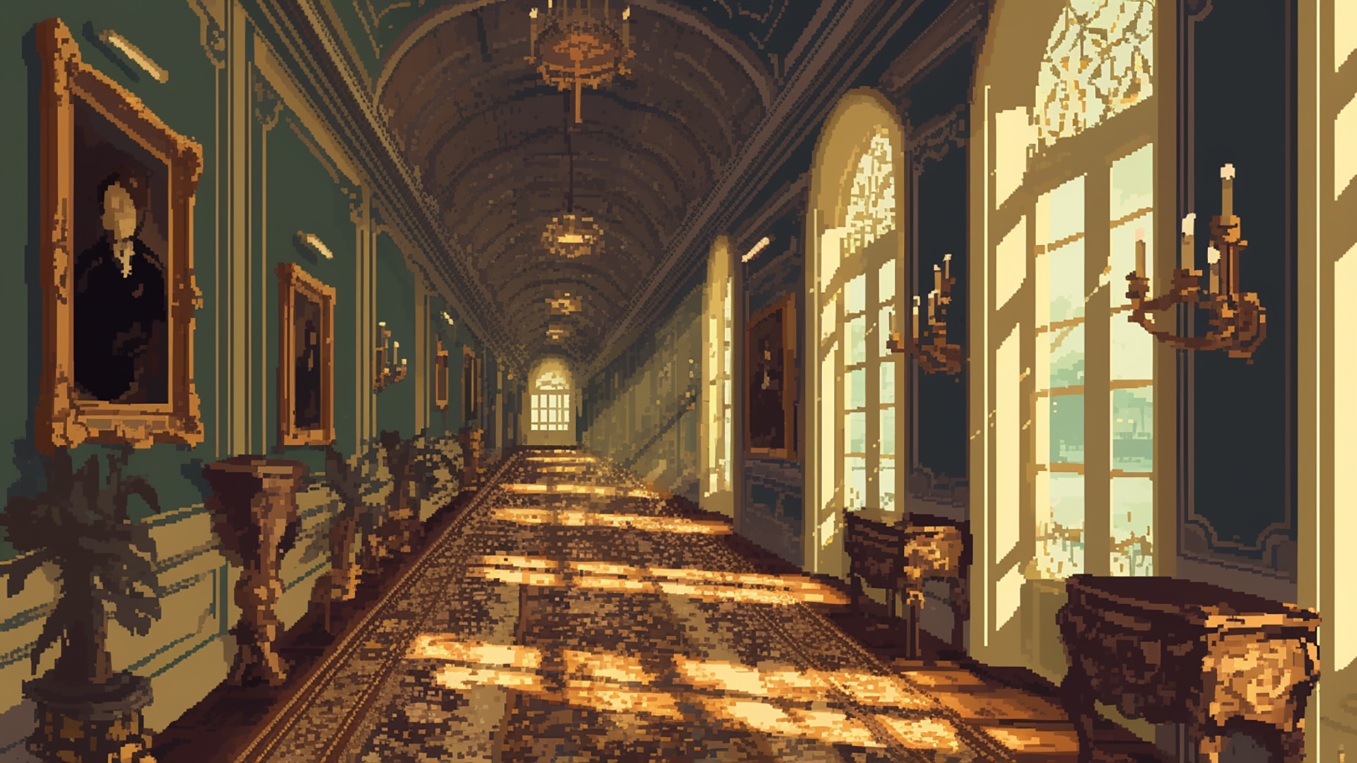 検索キーワード:お屋敷, 廊下, 照明, 豪華, ファンタジー, ドット絵, mansion, corridor, lighting, luxurious, fantasy, pixel art