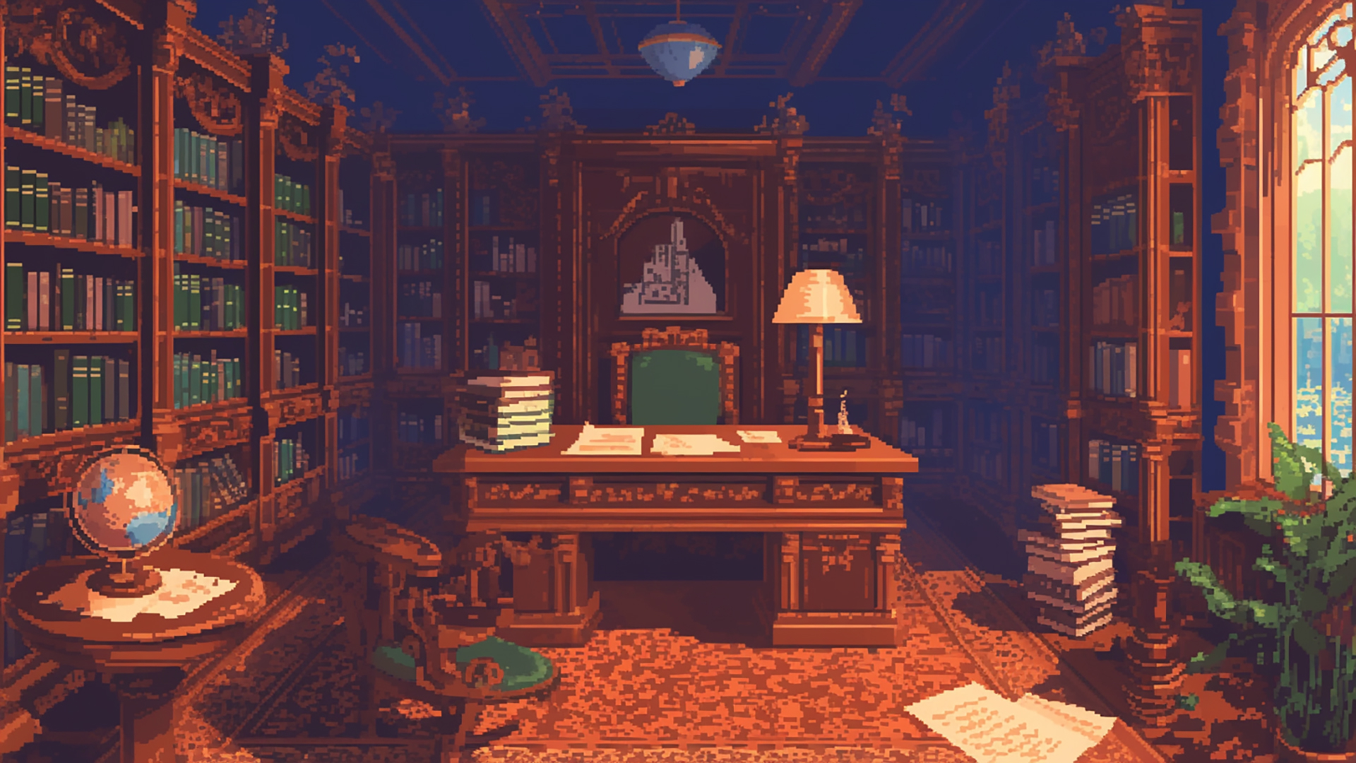 検索キーワード:お屋敷, 書斎, 本棚, 静寂, ファンタジー, ドット絵, mansion, study, bookshelf, silence, fantasy, pixel art