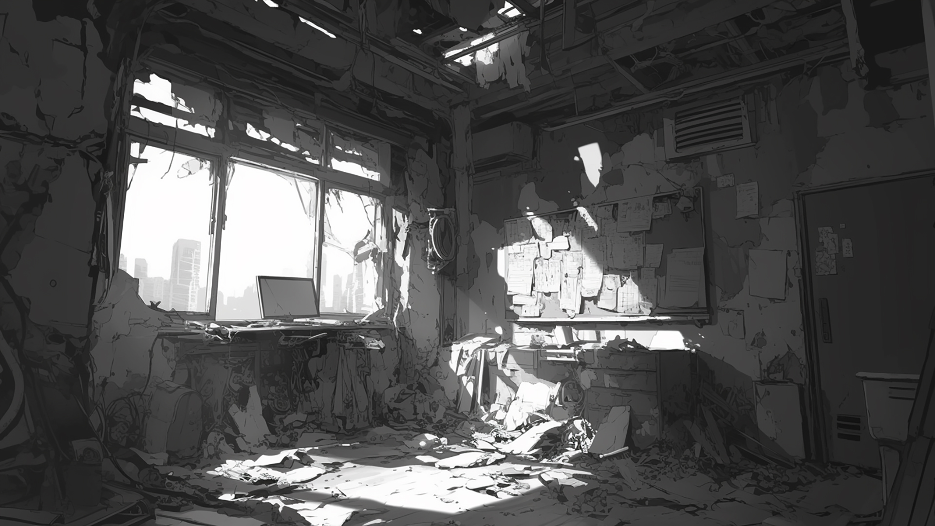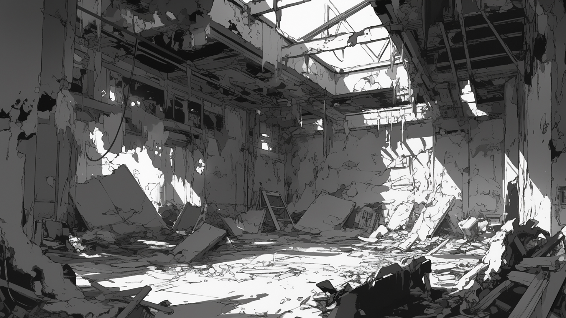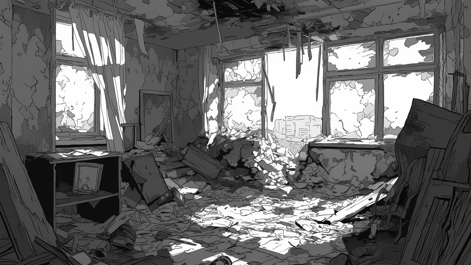 モノクロ|廃墟・壊れた建物・トーン陰影(3枚)