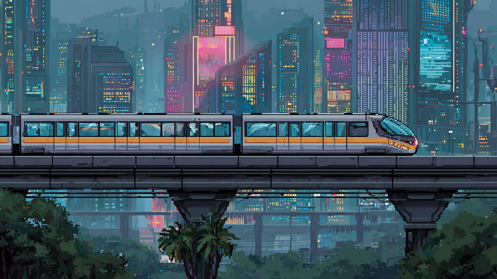 検索キーワード:ドット絵, 未来都市, モノレール, 高層ビル, 夜景, 近未来, dotpixel, futurecity, monorail, skyscrapers, nightview, cyberpunk