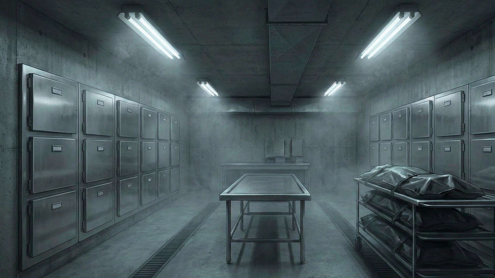 検索キーワード:地下シェルター, 霊安室, モルグ, 死体安置所, 終末世界, ホラー, 地下施設, 遺体, 閉鎖空間, 恐怖, underground shelter, mortuary, morgue, funeral home, dead body, post-apocalyptic, bunker, horror, creepy, isolation, cold room