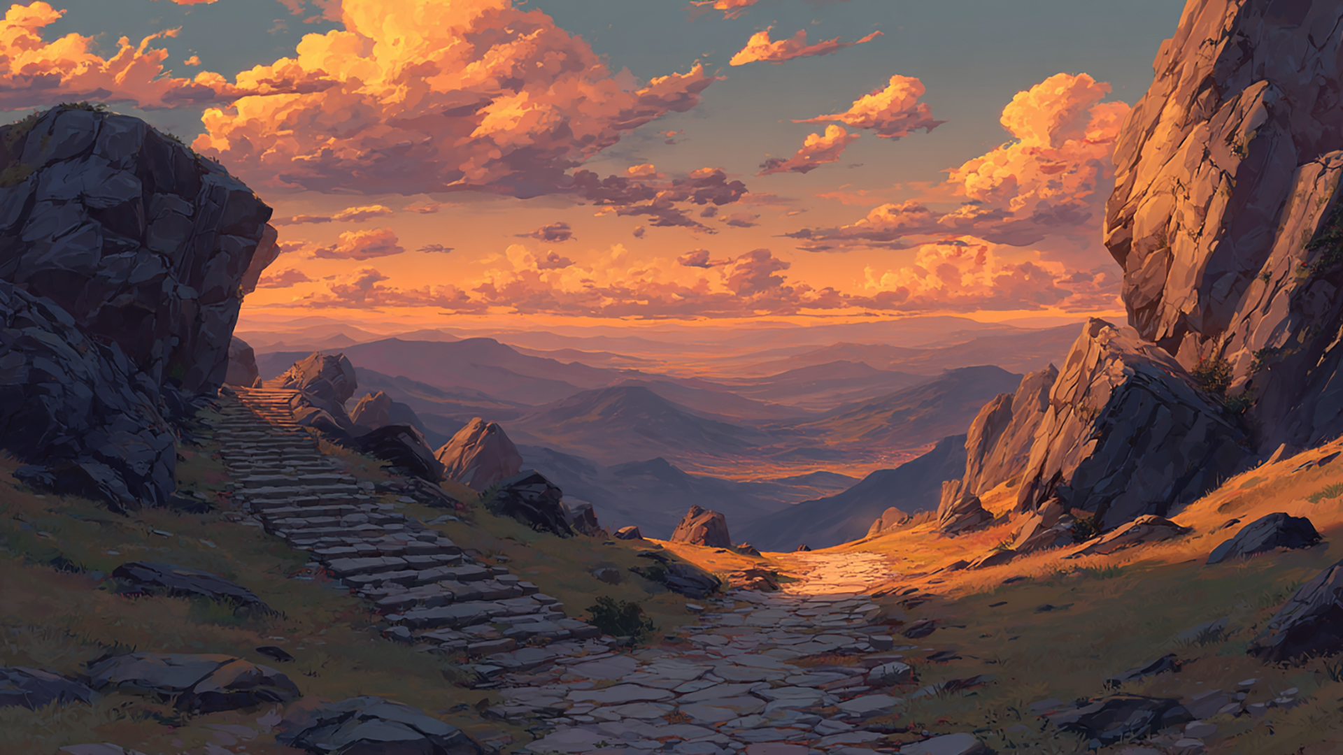 検索キーワード:山道, 峠, 夕暮れ, ファンタジー, 冒険, 旅路, mountain path, mountain pass, sunset, fantasy, adventure, journey