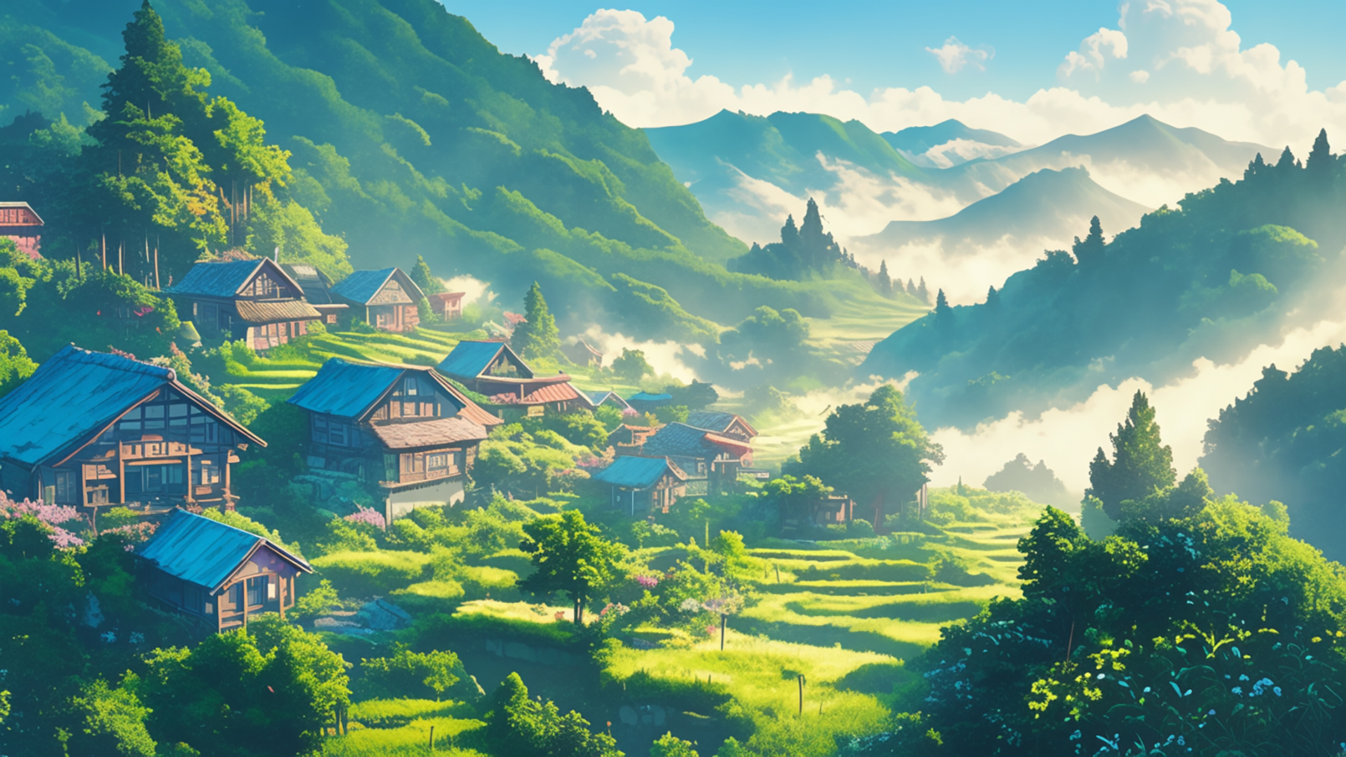 検索キーワード:山間, 村, 自然, 家, 風景, 静寂, mountain valley, village, nature, houses, scenery, silence