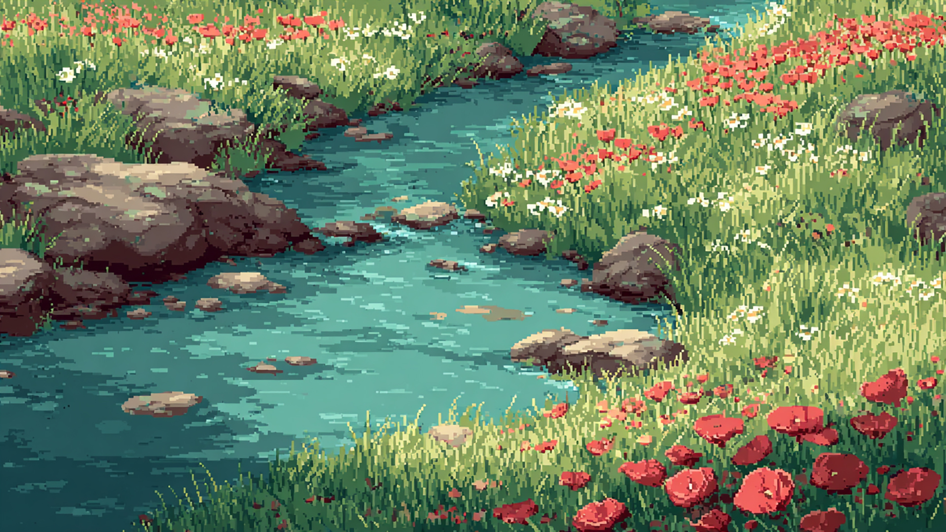 検索キーワード:ドット絵, 小川, 春, 水辺, 自然, 風景, dotpixel, stream, spring, water, nature, landscape